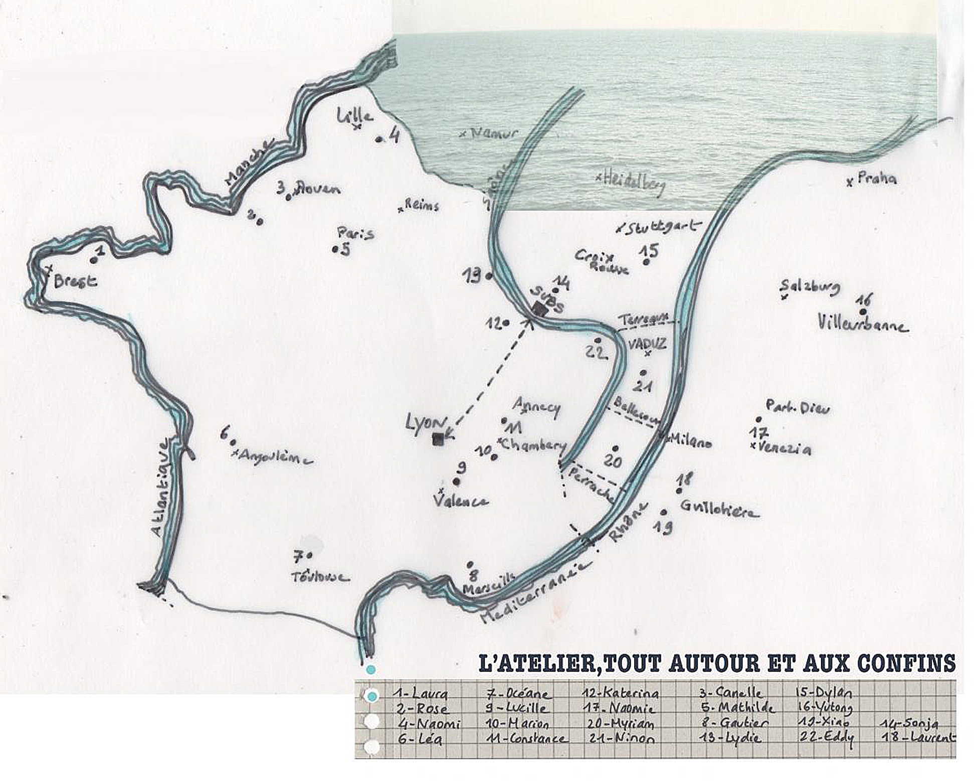 Dans cette représentation subjective, les rivages maritimes et fluviaux se mêlent et deux échelles doivent se superposer pour nous inclure toustes : celle du plan de Lyon et celle de la carte de France. Cela entraine que Venezia se met ici à côtoyer la Part-Dieu (ce qui historiquement n’est pas stupide car jusqu’au XXe siècle, la zone était régulièrement inondée par le Rhône non encore canalisé).