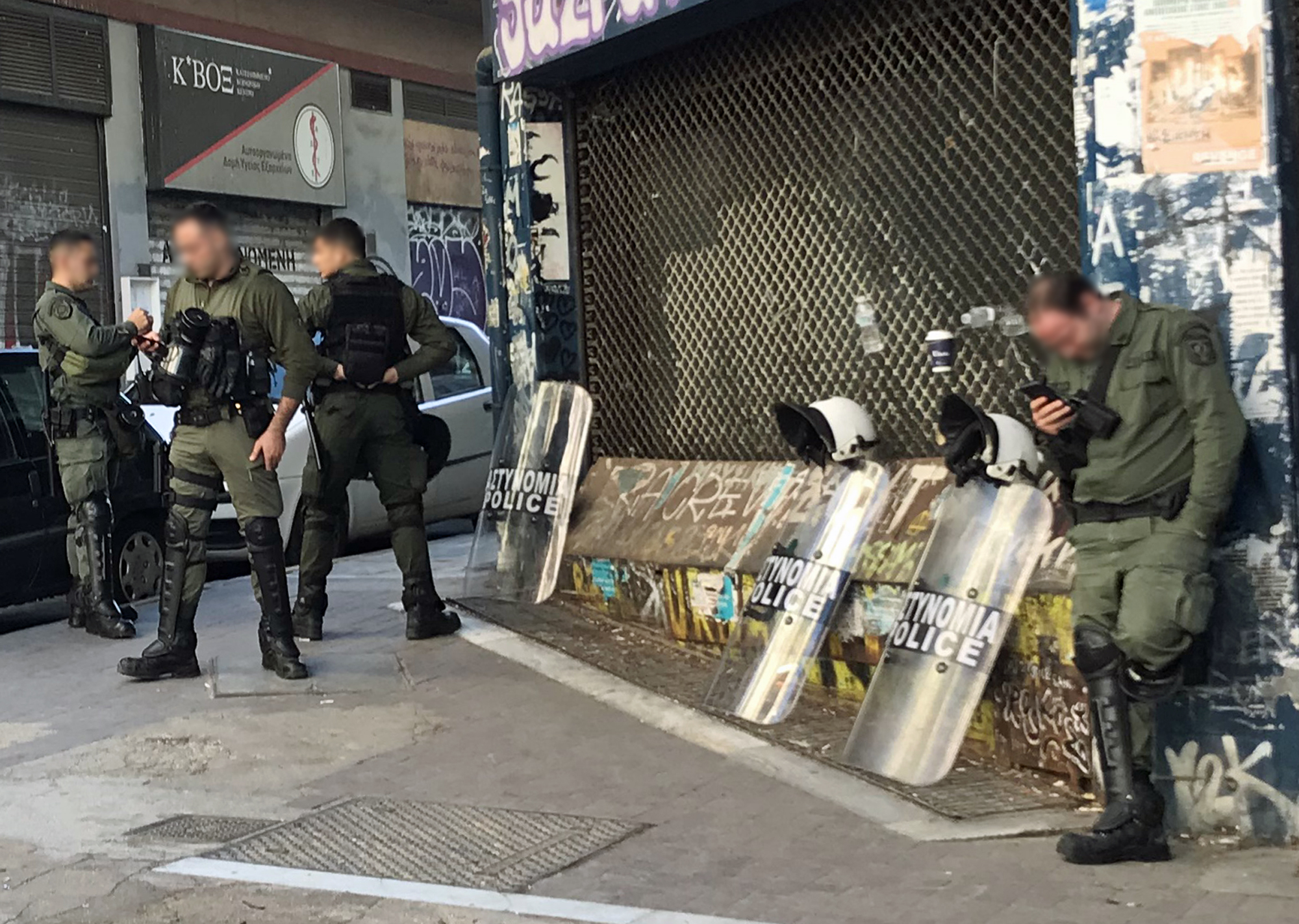 L’omniprésence de policiers armés jusqu’aux dents créé une situation de malaise, qui choque les personnes qui visitent le quartier et opprime les résidentes. En effet, une quarantaine d’agents gardent 24 heures sur 24 l’imposante clôture de tôle et de grillage de 5 mètres de haut qui barricade le chantier de la place Exárcheia. On se sentirait presque en zone occupée. « Depuis que des policiers grossiers surveillent notre quartier, j’ai commencé à ressentir le corps masculin comme une menace », déclare Anna Julia. Des cas de harcèlement, de « taquineries » et de gestes déplacés de la part des policiers ont été officiellement constatés. Au café, on entend souvent les gens se plaindre du fait que les policiers affectés à la surveillance des travaux publics appliquent la loi du plus fort sans aucune discrimination. Il y a eu des passages à tabac gratuits de parents devant leurs enfants, des gaz lacrymogènes pulvérisés sur des citoyennes lors de marches de protestation et des gestes obscènes.