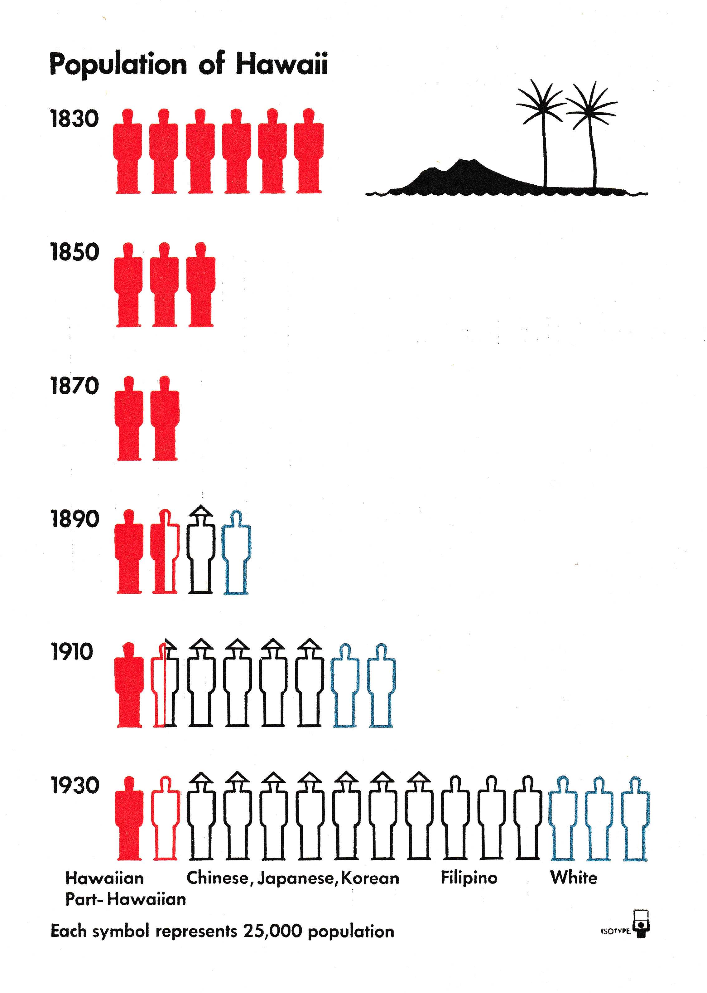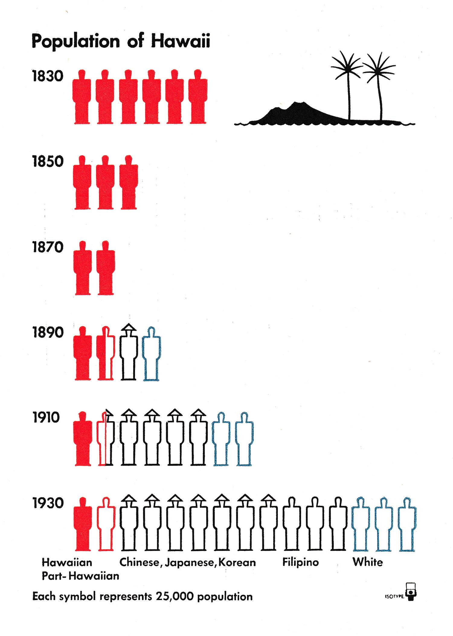 L’« image-guide » en haut à droite représente des éléments géographiques caractéristiques de l’île : ses volcans et ses palmiers. Ce type de vignette vient appuyer le titre : le propos d’un Isotype doit être saisi dès le premier regard. Chaque silhouette représente 25.000 personnes. Les pictogrammes rouges et pleins représentent les autochtones, les silhouettes évidées aux contours rouges les personnes métisses, les silhouettes aux contours noirs les personnes immigrées : d’origine asiatique quand elles sont coiffées d’un couvre-chef (Chine, Japon, Corée), à la tête nue quand elles viennent des Philippines. Les immigrantes d’origine européenne sont représentées par un pictogramme au contour bleu.
