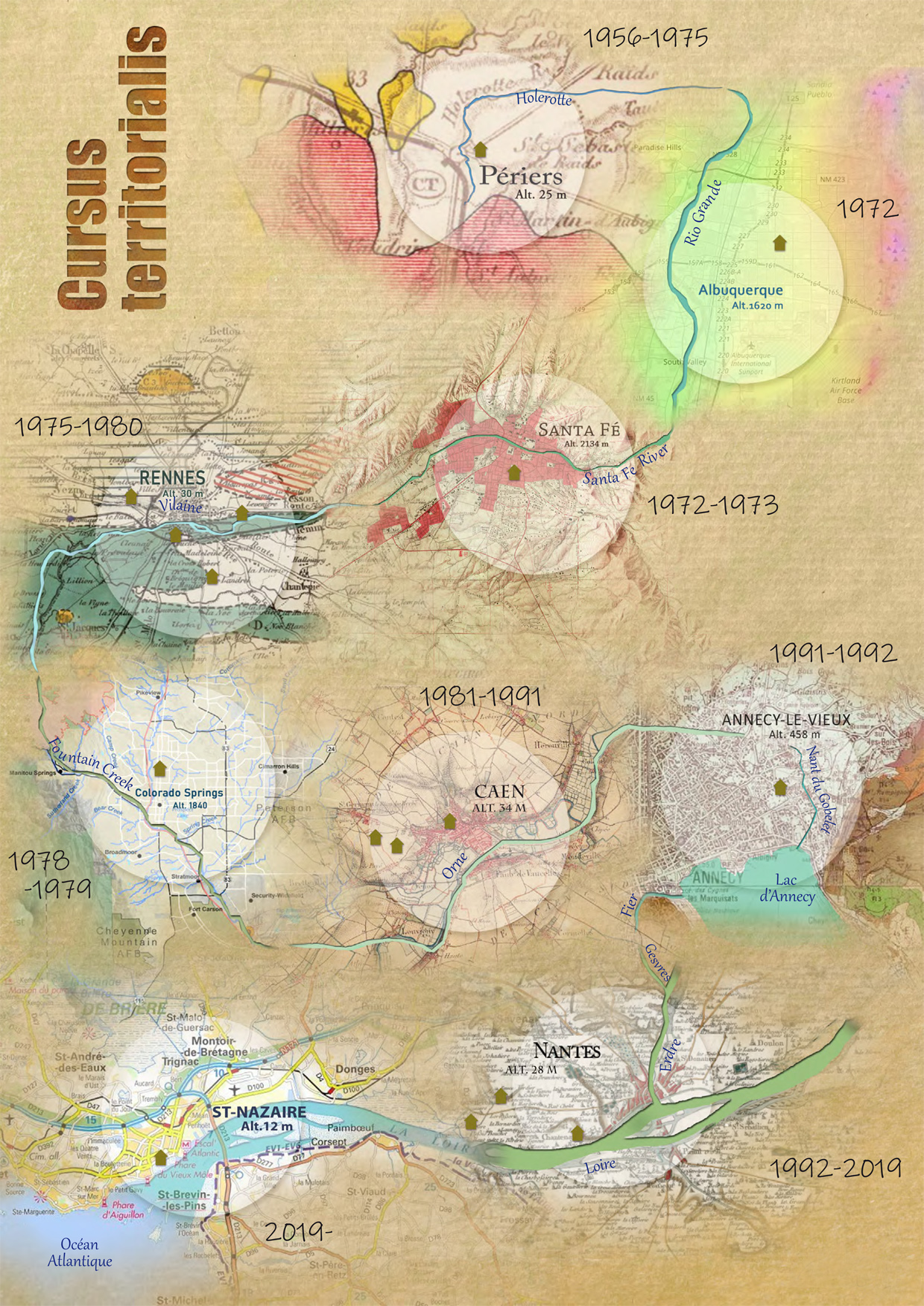 Ressentant le besoin de témoigner de mon parcours personnel, j’ai eu l’idée d’une « trace » géographique de mes différents lieux de vie. Après réflexion sur la forme (j’avais envisagé de graver du bois), j’ai finalement décidé de travailler sur ordinateur : les logiciels pratiqués dans mon passé professionnel de graphiste me permettaient de travailler plus vite et de bénéficier d’effets de superposition et de fondu intéressants.