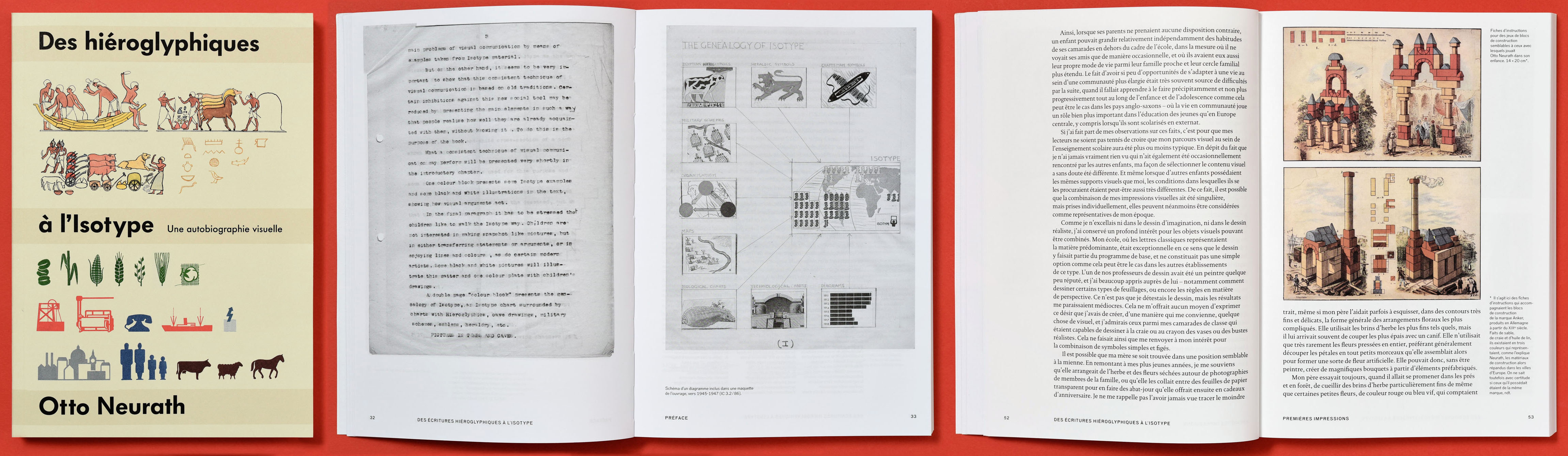 L’histoire éditoriale de cet ouvrage est singulière. Neurath avait souhaité écrire une « autobiographie visuelle », une sorte d’inventaire exhaustif de toutes les sources d’inspiration qui ont nourrit son œuvre majeure, l’Isotype, un système de visualisation de l’information au moyen de graphiques. Pour cela, l’album devait comporter des centaines d’images, telles que l’auteur et son équipe n’ont cessé de les collectionner pour leurs différents musées et instituts. C’est à partir d’un fond bigarré de manuscrits, de tapuscrits, de maquettes et d’images de tous ordres que l’éditeur anglais [2] est parvenu à reconstituer, dans une démarche quasi archéologique, l’intention éditoriale de l’auteur.