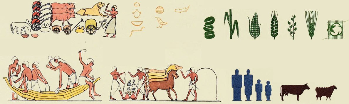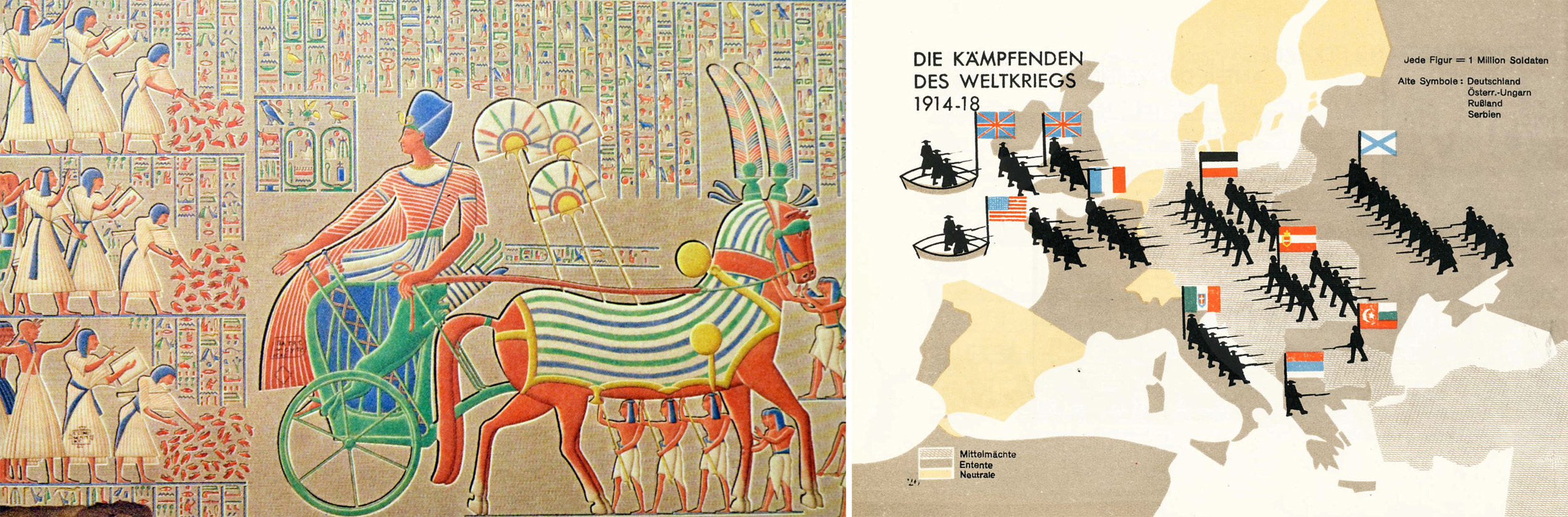 C’est au département égyptien du Musée d’histoire de l’art de Vienne qu’il va parfaire son éducation visuelle. Les hiéroglyphiques [4], ces caractères composés d’idéogrammes et de phonogrammes qui associent une image à une idée, le laissent imaginer un langage universel, à l’instar du volapük, de l’esperanto ou de l’ido [5]. Ici naît l’idée du langage visuel de l’Isotype. Ce sont justement les peintures murales égyptiennes reproduites dans ce musée qui lui fournissent l’idée maîtresse de ce « langage international », à savoir la répétition d’une même figure pour signifier un certain nombre d’objets ou de personnes.