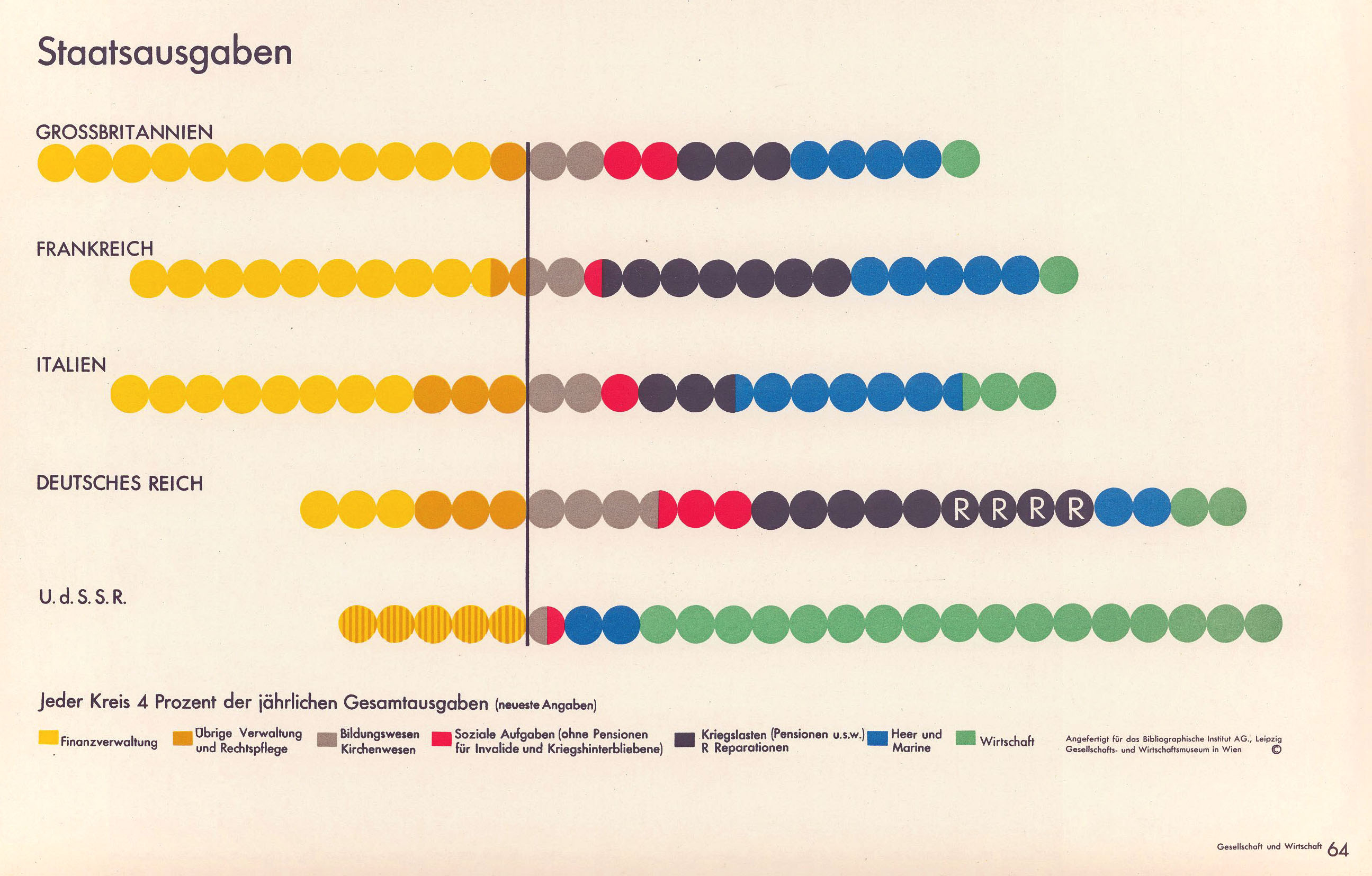 En y regardant de plus près, on constate que seule l’Union soviétique n’investit dans aucun autre territoire, ni ne dépend d’investissements étrangers. Tous les autres États sont en situation d’interdépendance. Ce parti pris d’une mise en avant de l’indépendance de l’URSS correspond à la vision qu’a l’économiste Otto Neurath de la meilleure forme de gestion possible d’un pays : celle d’une économie planifiée et centralisée. Selon l’ingénieur social, le choix du capitalisme sauvage et du marché libre sont une erreur fatale pour l’humanité. Les succès que semble engranger l’URSS dans les années 1930 le confortent en ce sens et certaines productions Isotype du musée de Vienne, qu’il anime avec Marie Reidemeister (après 1941 : Marie Neurath), montrent à loisir la supériorité économique et sociale de l’expérience soviétique. En ces temps où la croyance en une inéluctabilité du capitalisme ne s’est pas encore généralisée, la jeune Union soviétique suscite l’intérêt jusqu’aux États-Unis [1].