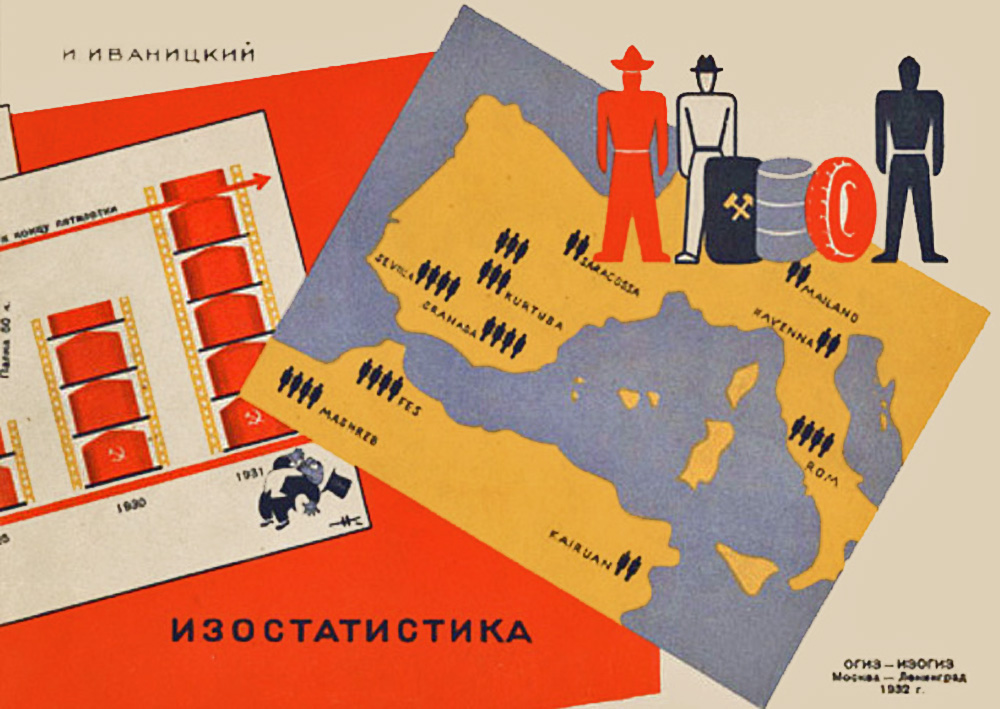 La statistique est la base du plan économique […]. Dans aucun pays du monde la statistique ne joue un rôle aussi grand que dans l’Union soviétique. L’édification socialiste de l’Union soviétique apporte un accroissement des chiffres de la production, de la consommation et du travail culturel. Mais comprendre des rangées de chiffres, les comparer entre elles n’est pas l’affaire de tous. Comment est-ce qu’on peut intégrer l’essentiel au plus vite ? Comment est-ce qu’on peut apprendre sans y consacrer trop de temps ? Dans un décret cosigné par Lénine, il est déjà exigé que l’on montre des statistiques facilement compréhensibles sur les lieux publics, dans les rues, dans les lieux de réunion. Cela nécessite un système de représentation visuelle [6].
