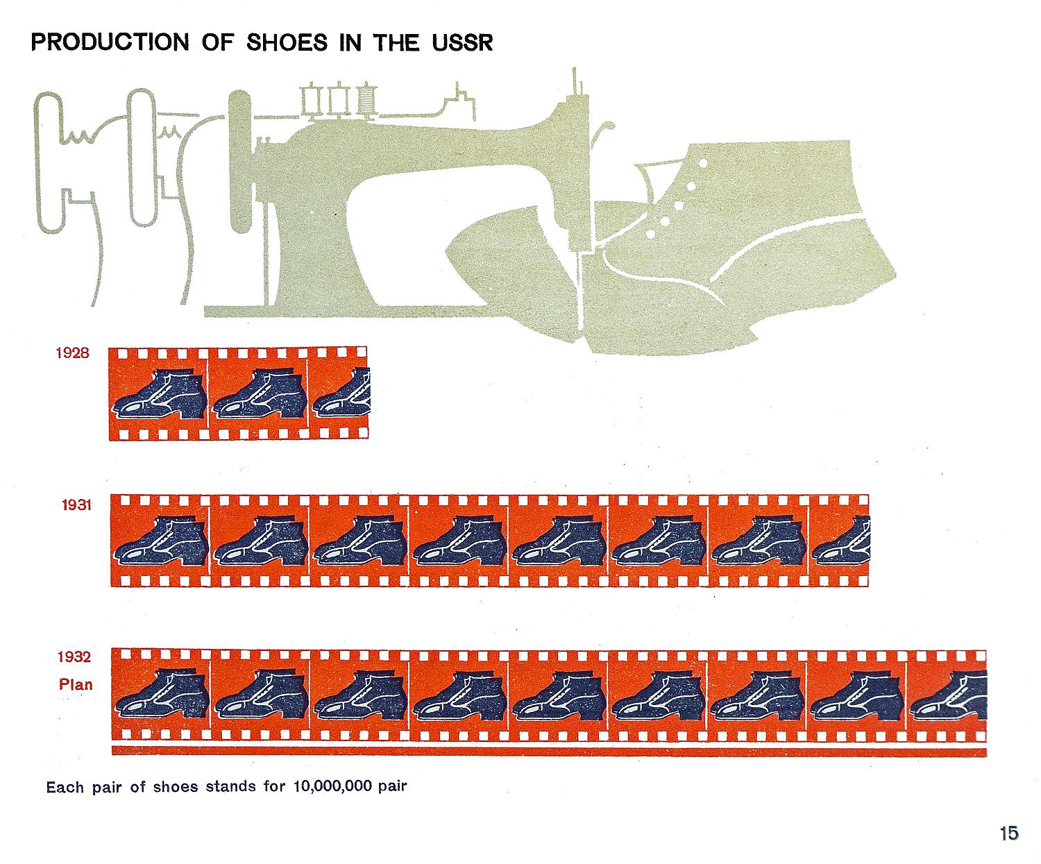 L’Izostat est particulièrement productif et différentes expositions et publications voient le jour, notamment dans la Pravda et l’Izvestija. Entre mars et mai 1932 paraissent dans ce dernier journal la série « Chez eux et chez nous », à base de statistiques Isotype comparant des réalisations économiques entre l’URSS et d’autres pays. Des affiches et des albums célèbrent les 15 ans de l’Union soviétique et les deux premiers plans quinquennaux. Trois numéros du Carnet Iso de l’agitateur sont également illustrés d’Isotype.
