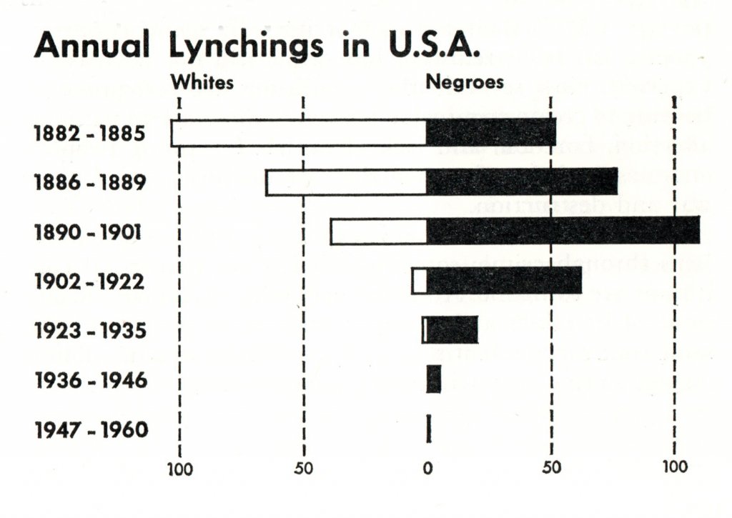 S’ensuit le décompte des délits reprochés, classés par type et par État. Le meurtre et le viol s’avèrent les accusations les plus courantes. L’Alabama et la Géorgie sont de loin les États où le lynchage est le plus fréquent. Une rubrique indique : « Lynché parce que le jury l’a acquitté », un passage est consacré au « Lynchage d’attardés mentaux ». Les descriptions des différents cas de lynchage sont rédigées dans un style journalistique et se veulent exemptes de tout pathos.