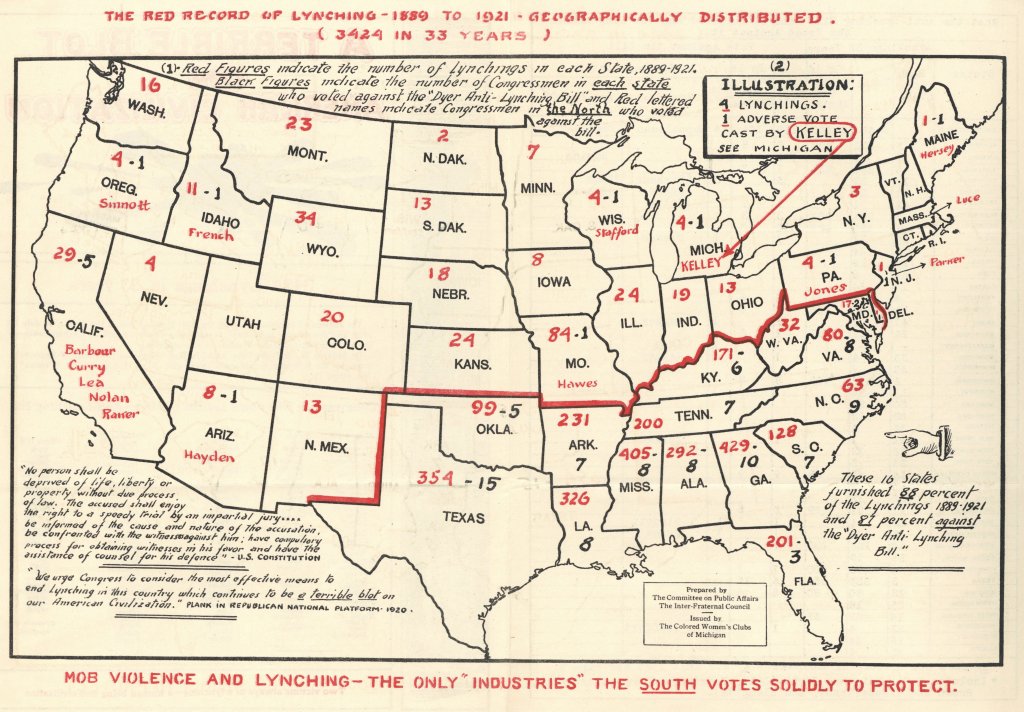 Très vite, ces données statistiques seront cependant cartographiées. Ainsi, en 1922, pour appuyer son projet de loi anti-lynchage auprès du Sénat, Leonidas Dyer, représentant du Missouri, présente-t-il cette carte au Congrès :