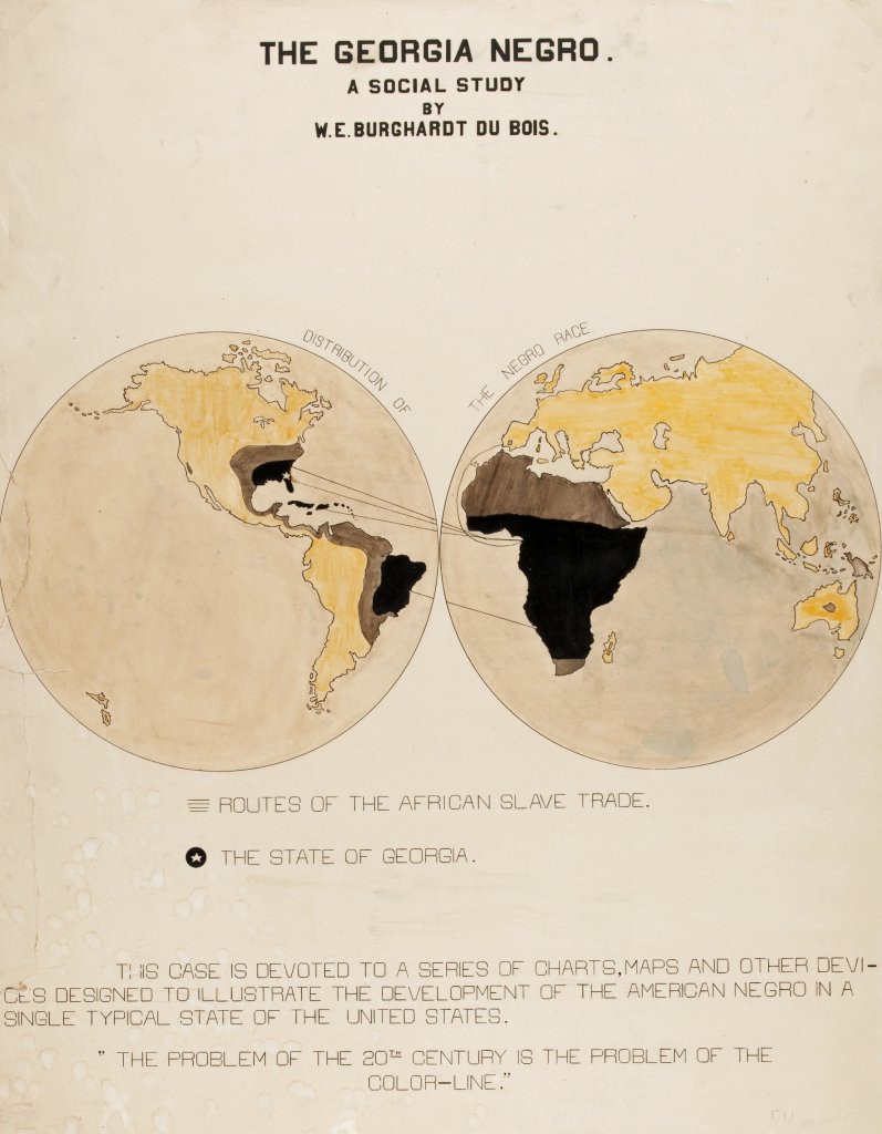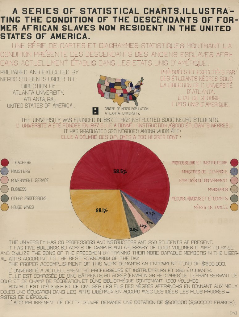 Alors que l’exposition comporte un « Pavillon de Madagascar » exhibant un zoo humain, la section du groupe de Du Bois montre 500 photos et un important corpus de données socio-économiques sur la situation effective de la population noire aux USA : démographie, éducation, activité professionnelle, propriété, etc. L’enquête porte sur tous les aspects de la vie. Se dessine l’image d’une population dynamique, ayant sa part entière à l’activité économique du pays. La particularité des diagrammes, coloriés à la main, est qu’ils prennent des formes graphiques absolument inédites. Ce travail est précurseur, non seulement des infographies d’aujourd’hui, mais aussi de la cartographie radicale.