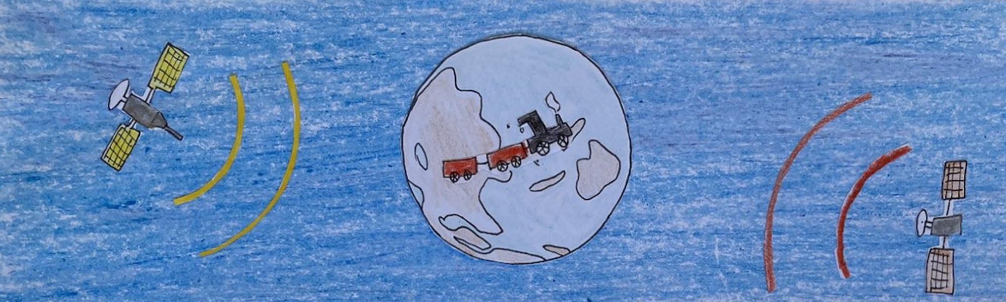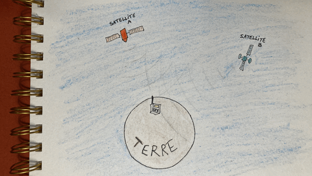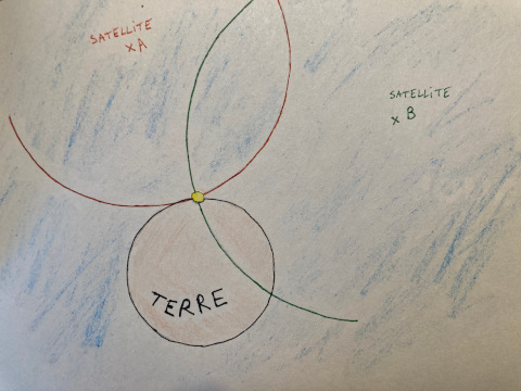 En réalité, l’espace est en trois dimensions (alors que le dessin est en deux dimensions), donc il faut trois satellites et non deux pour réaliser cette localisation. On utilise même en général un quatrième satellite pour plus de précision.