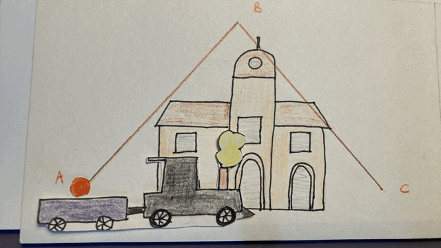 Mais imaginons qu’un observateur observe la scène depuis la gare. Il voit à la fois le mouvement de la balle par rapport au train et le mouvement du train par rapport à la gare. De son point de vue, autrement dit dans le référentiel de la gare, la balle parcourt la trajectoire A-B-C, dont la distance est égale à la somme des segments AB et BC. Nous observons que dans le référentiel de la gare, la balle parcourt une distance plus grande que dans le référentiel du train, dans la même durée de temps. Cela n’a rien d’étonnant, puisque la vitesse de la balle est plus grande dans le référentiel de la gare que dans celui du train (vitesse de la balle par rapport au train + vitesse du train par rapport à la gare).