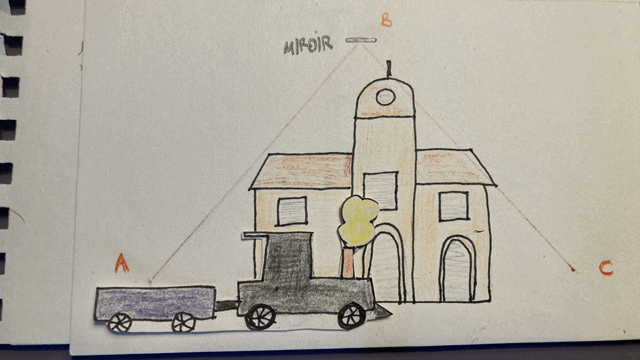 Imaginons alors une expérience semblable à la précédente, où cette fois il ne s’agit pas d’une balle mais d’un rayon lumineux que je fais partir à la verticale, alors que je me trouve dans le train. Cela pourrait être un rayon laser rouge qui se réfléchit sur un miroir placé au-dessus de moi. Exactement comme dans le cas précédent, le rayon lumineux parcourt la distance AB-BA dans le référentiel du train, et la distance AB-BC dans le référentiel de la gare. Mais cette fois, le second postulat affirme que la vitesse de ce rayon lumineux est la même dans les deux référentiels (contrairement à la balle). Autrement dit, la vitesse de la lumière et la vitesse du train ne s’additionnent pas.
