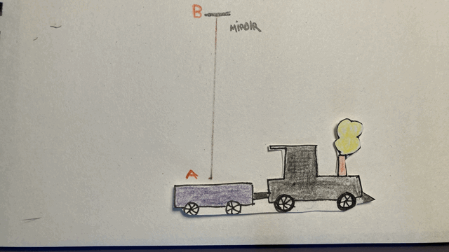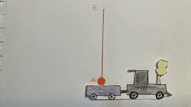 Allons un peu plus loin dans l’étude des référentiels. Le premier « postulat » que nous utiliserons spécifie que « les lois de la physique sont les mêmes pour tous les observateurs se trouvant dans des référentiels inertiels ». En particulier, si je lance une balle vers le haut, peu importe que ce soit sur la terre ferme ou dans un train qui se déplace, cette balle aura une trajectoire verticale. Imaginons donc que je sois dans un train, et que je lance ma balle vers le haut. De mon point de vue, aucune surprise, elle monte et redescend, en parcourant la trajectoire A-B-A. Ainsi, durant la durée définie par son départ et son retour au point A, la balle a parcouru une distance totale égale à deux fois le segment AB dans le référentiel du train.