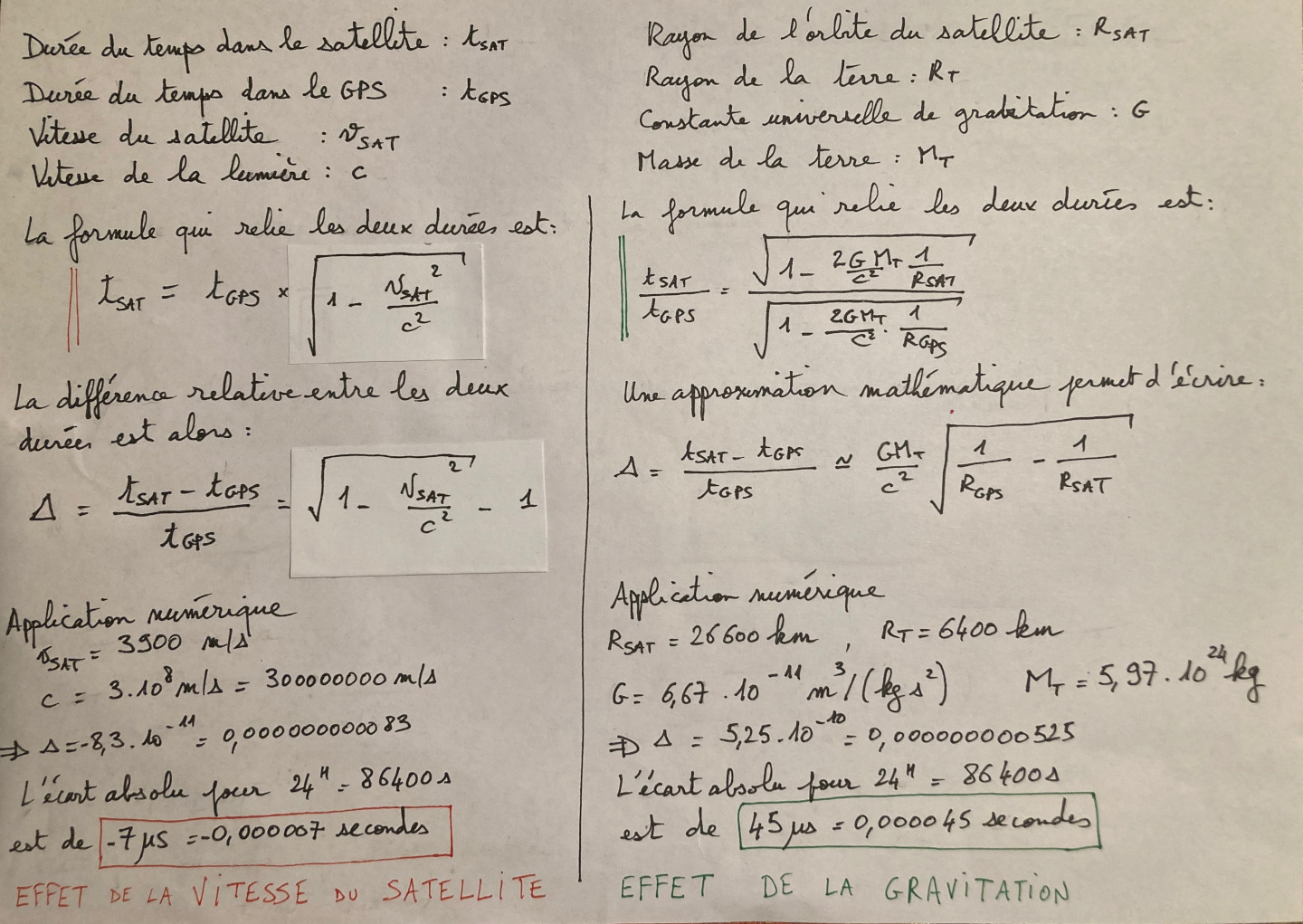 Les deux effets vont en sens inverses, il nous faut donc en venir aux calculs pour estimer l’effet global : quelle est la différence d’écoulement du temps entre la Terre et le satellite ? Vous pouvez regarder le détail des calculs sur l’image ci-dessous… ou vous contenter du résultat.