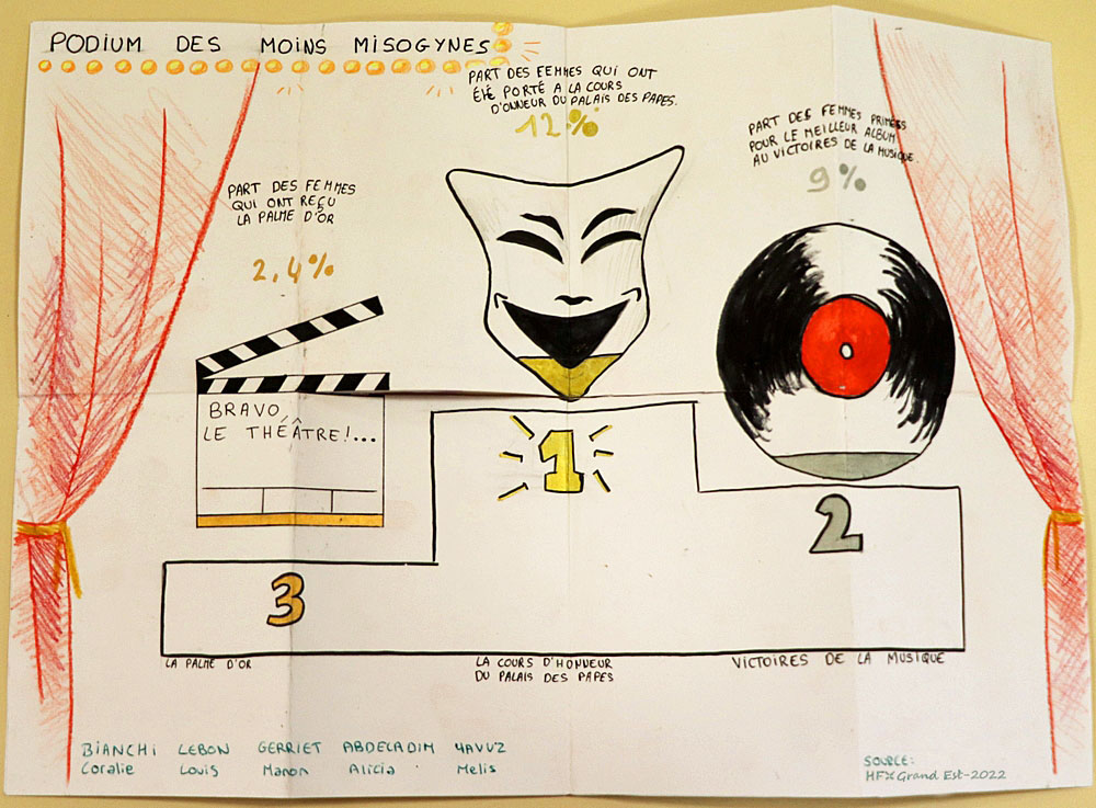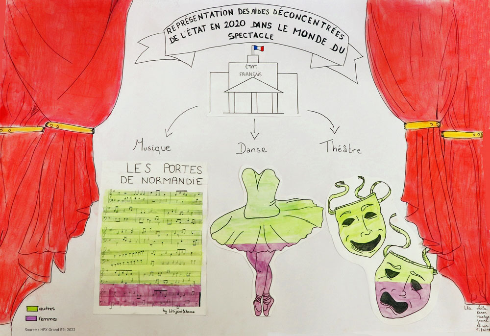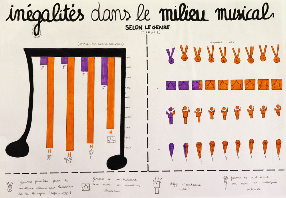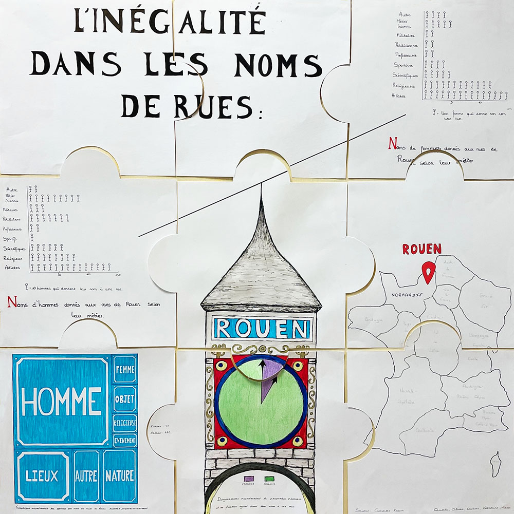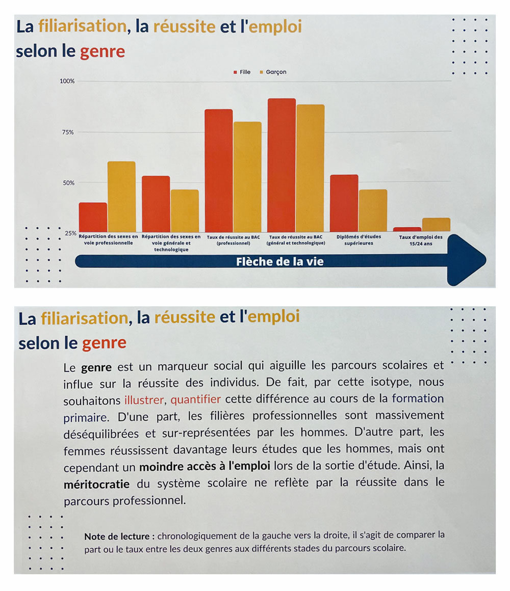 Apprendre aux jeunes à porter un regard critique sur la construction de la connaissance est l’un des défis de l’éducation et le meilleur garant du respect de la démocratie. Pendant l’année scolaire 2022/2023, 80 élèves du lycée Porte de Normandie de Verneuil sur Avre ont travaillé sur la question de l’égalité femmes-hommes, notamment dans le domaine des études, de la recherche, de la vie économique, de la politique et de la culture. Leurs graphiques Isotype, réalisés à partir de bases de données publiques, font l’état des lieux de l’un des grands enjeux du XXIe siècle : l’égalité des chances et de traitement entre les femmes et les hommes.