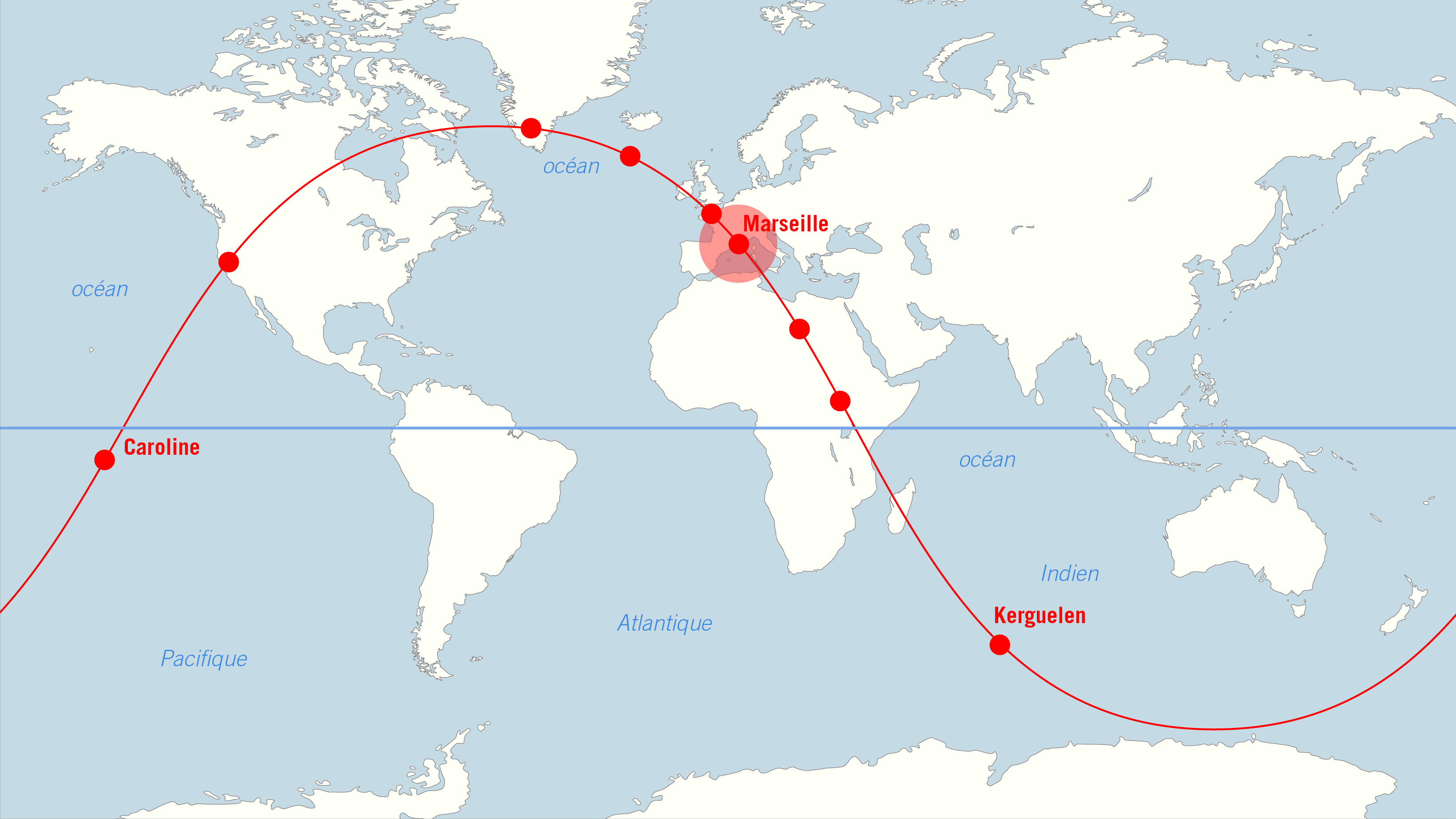 Chaque performance est organisée en une quinzaine d’étapes et à travers autant de documents cartographiques. Ils composent un itinéraire autour du monde en suivant en ligne droite un « méridien » déterminé par le lieu du spectacle. Pour chacun, en fonction de sa position, de son orientation, de son histoire, de sa relation avec d’autres lieux… les auteurs définissent un voyage qui prend la forme d’un tour de la Terre de 40 000 kilomètres. Les cartes sont sélectionnées suivant cet itinéraire et elles sont exposées comme les étapes d’un voyage qui s’achève là où il a débuté. Ainsi, à chaque lieu de spectacle, correspondent un itinéraire et des documents cartographiques spécifiques.