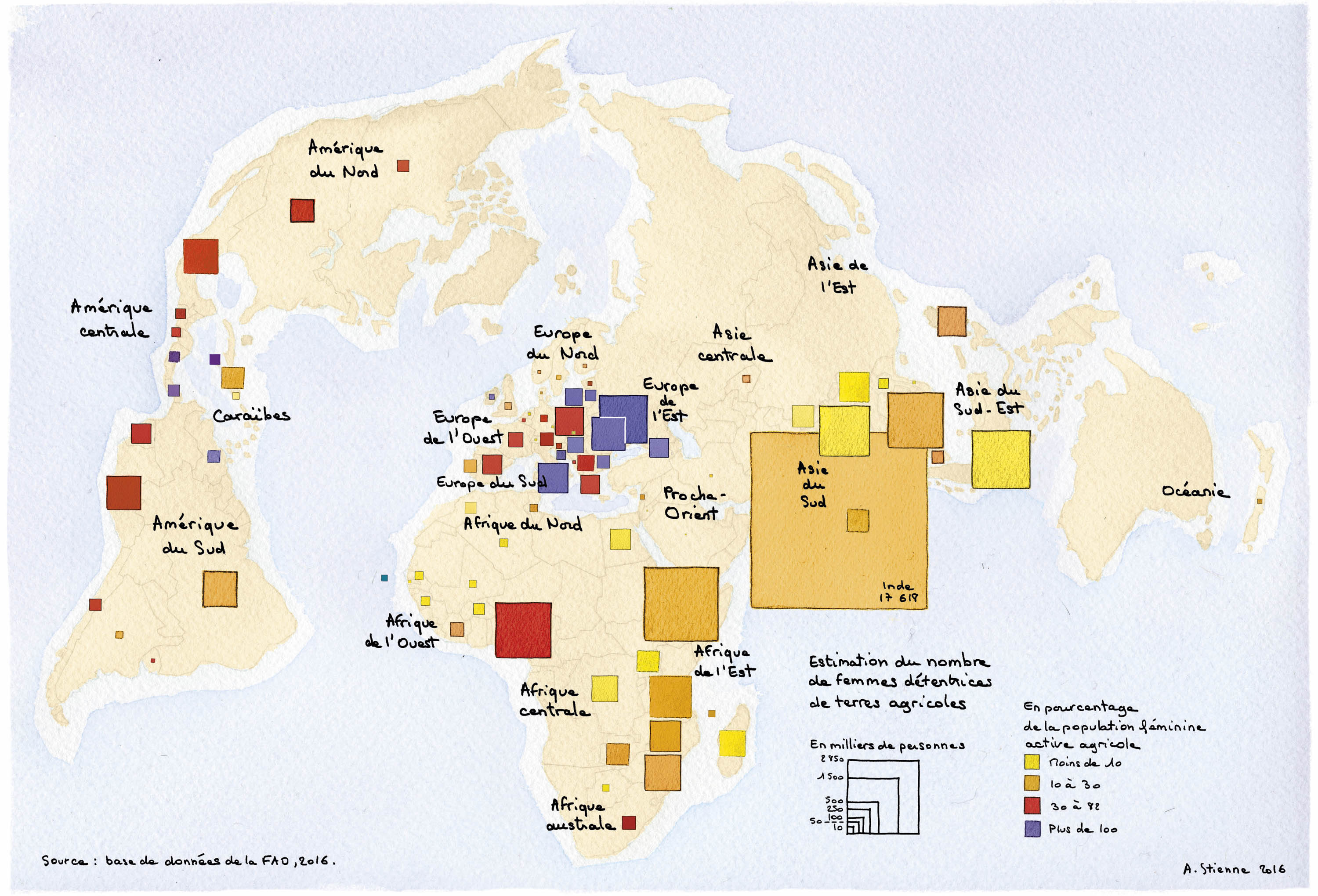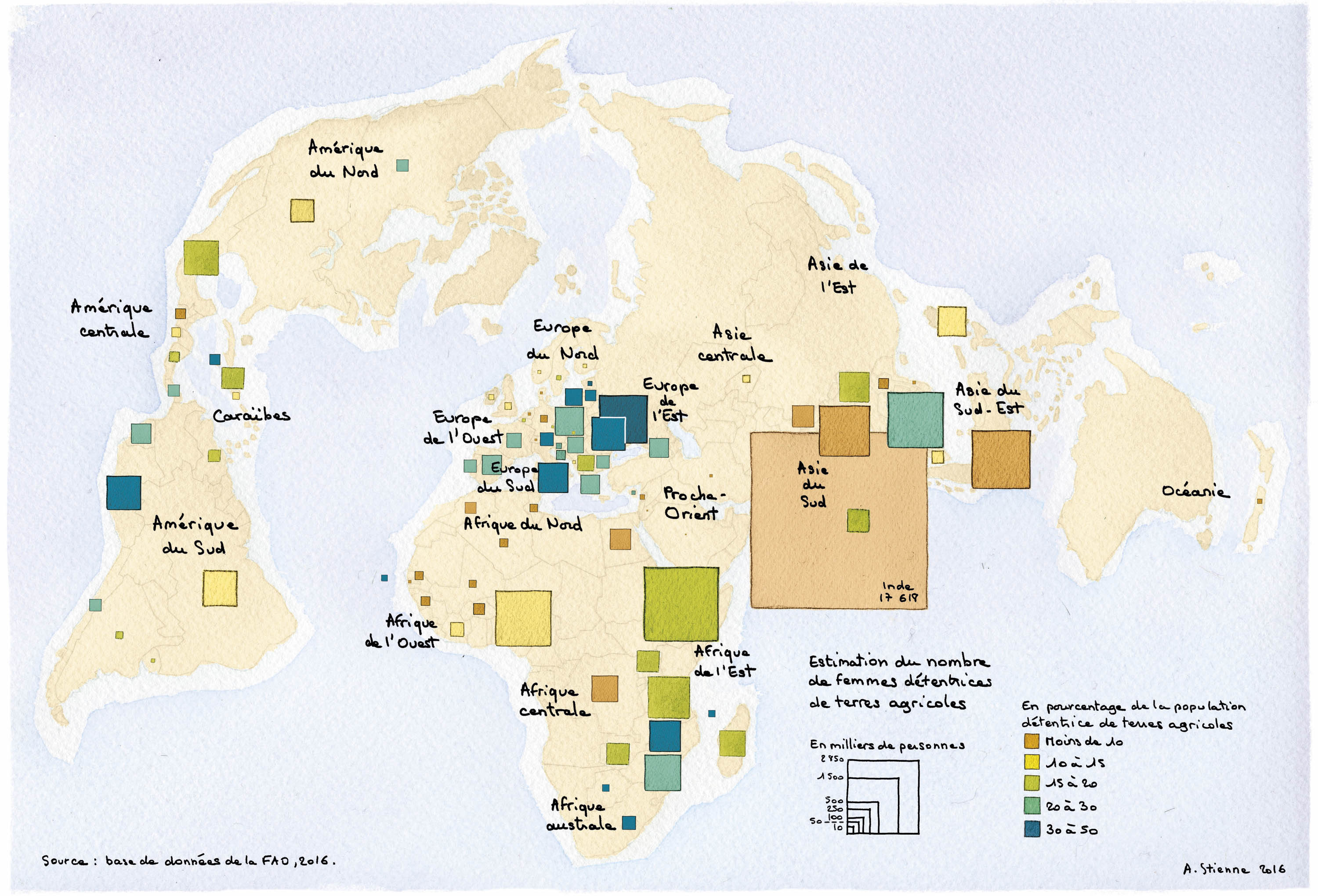 L’accès à la terre est un préalable primordial à la production de cultures vivrières ou commerciales. Les normes sociales patriarcales interdisent ou restreignent pourtant ce droit fondamental pour les femmes. À peine 14 % d’entre elles gèrent des terres agricoles (propriété, location, droit d’usage ou métayage). Parmi les propriétaires, toutes ne sont pas agricultrices, comme le montre la carte ci-dessous : en Europe de l’Est et en Amérique latine quelques pays comptent davantage de détentrices de terres que d’agricultrices. Les hommes possèdent des actifs fonciers bien plus étendus. À cet égard, les inégalités les plus importantes ont été constatées au Pakistan, au Bangladesh et en Équateur où la moyenne des parcelles détenues par les hommes est au moins deux fois supérieure à celles des femmes. Enfin, les terres réservées aux femmes sont de moindre qualité.