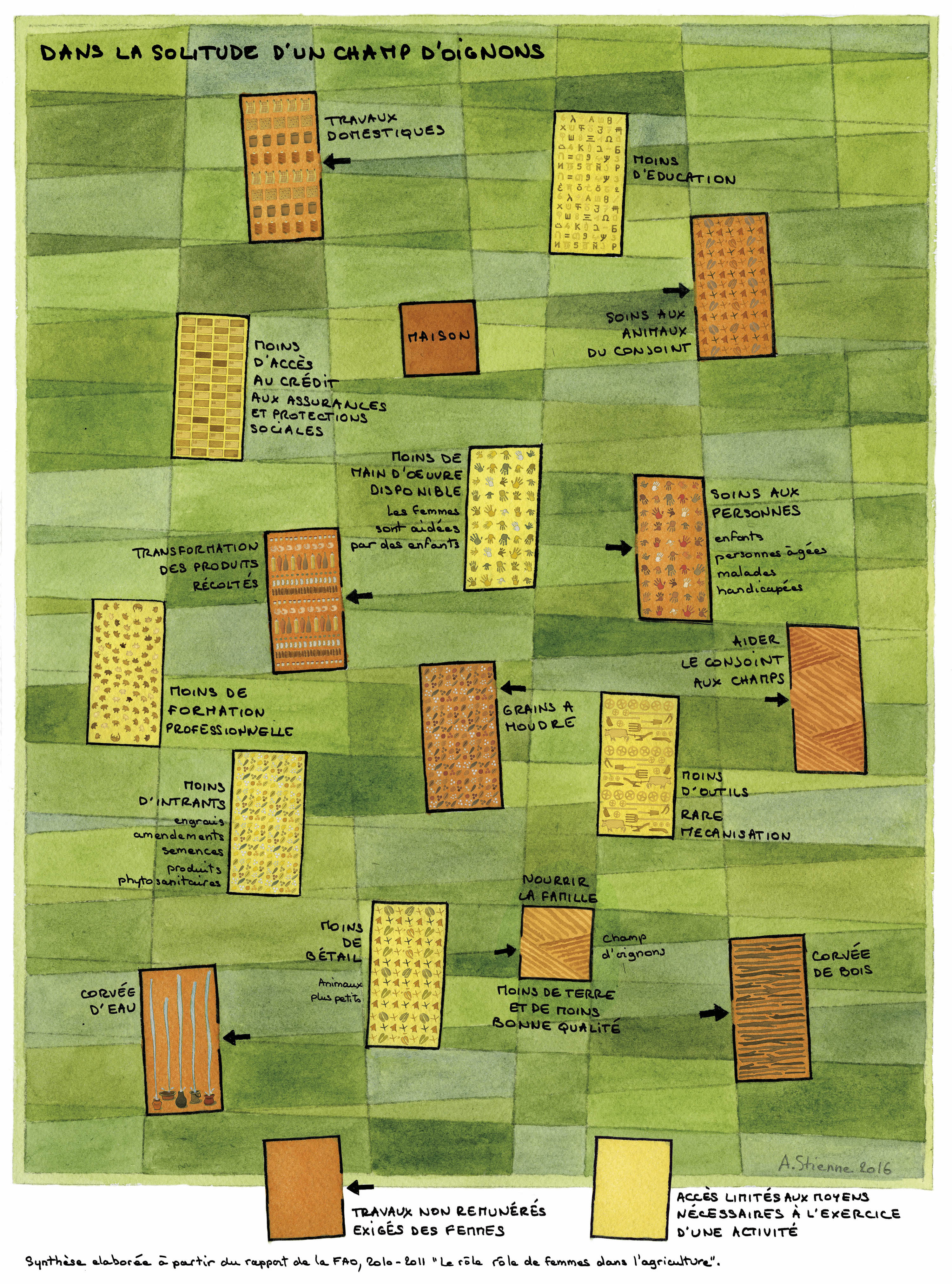 43 % de la main d’œuvre agricole est féminine. Dans des conditions météo normales, le bien-être des communautés rurales repose en grande partie sur les ressources alimentaires apportées par les femmes. Si par chance les paysannes vendent une part de leur production, l’argent perçu profite directement aux enfants qui peuvent avoir accès à de meilleurs services de santé et d’éducation. Le bénéfice de leurs efforts serait bien supérieur si elles ne rencontraient pas tant d’obstacles sur leur chemin. Car, outre le poids des travaux domestiques et des soins aux personnes qui limitent leur temps disponible à leur activité, rémunérée ou non, elles doivent faire face à tout un ensemble de discriminations pour l’accès aux moyens de production.