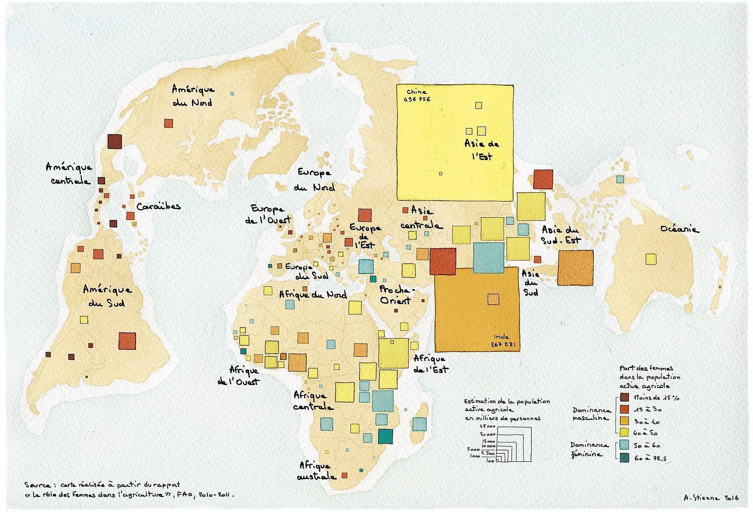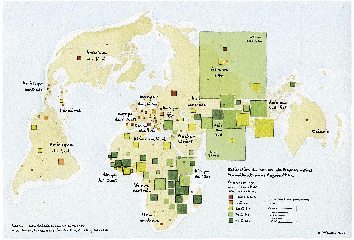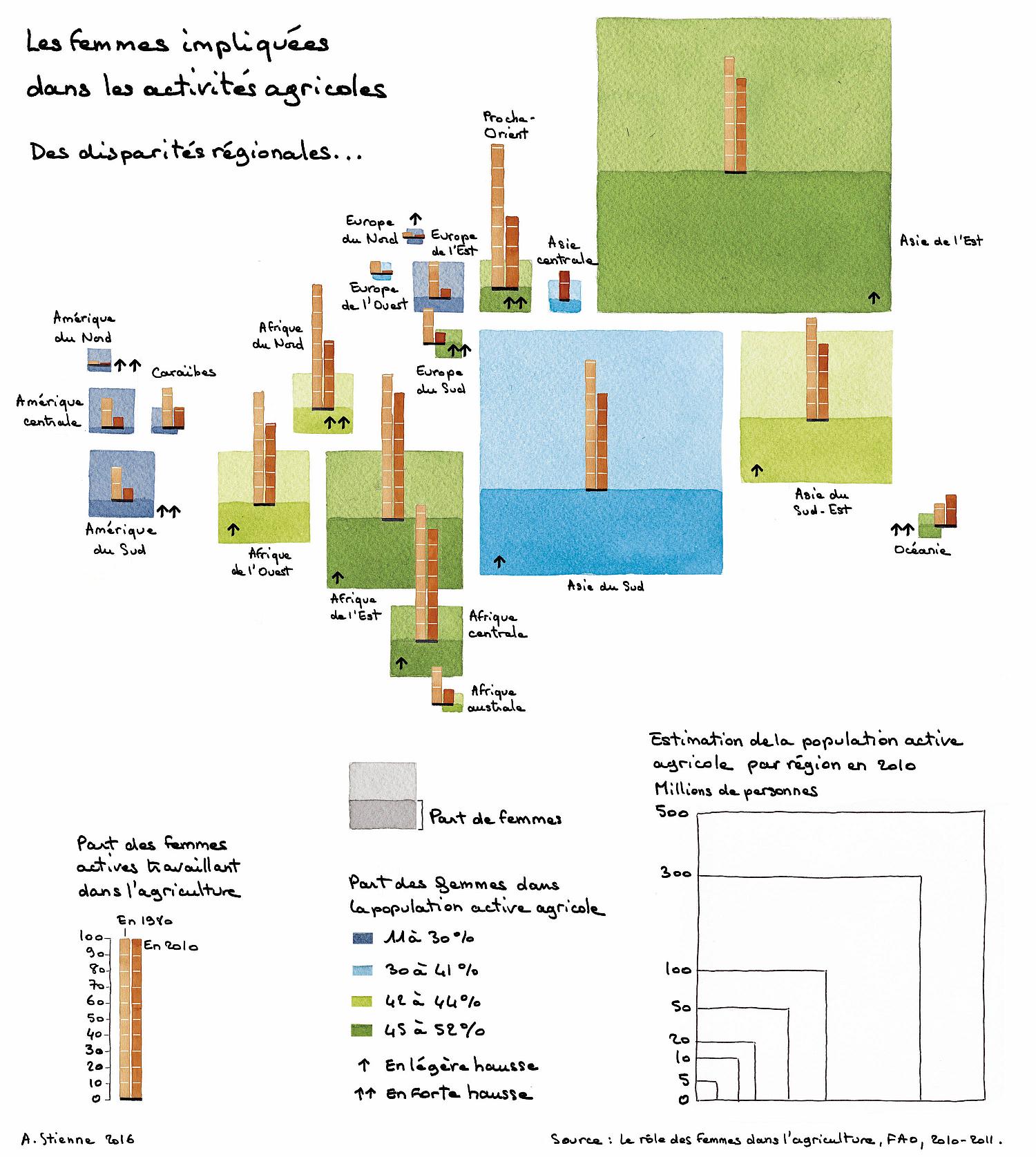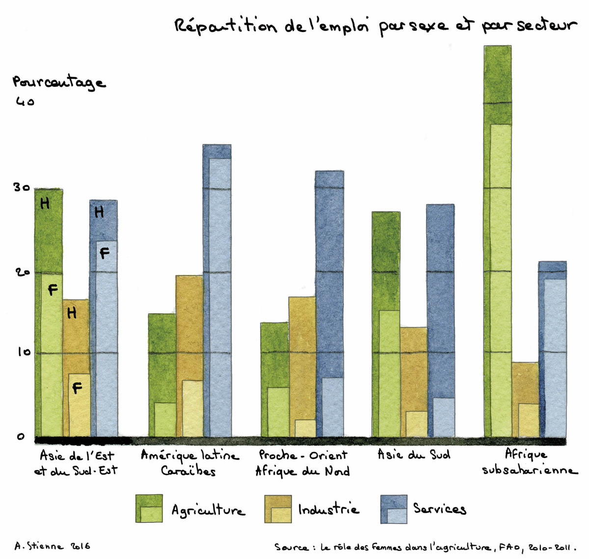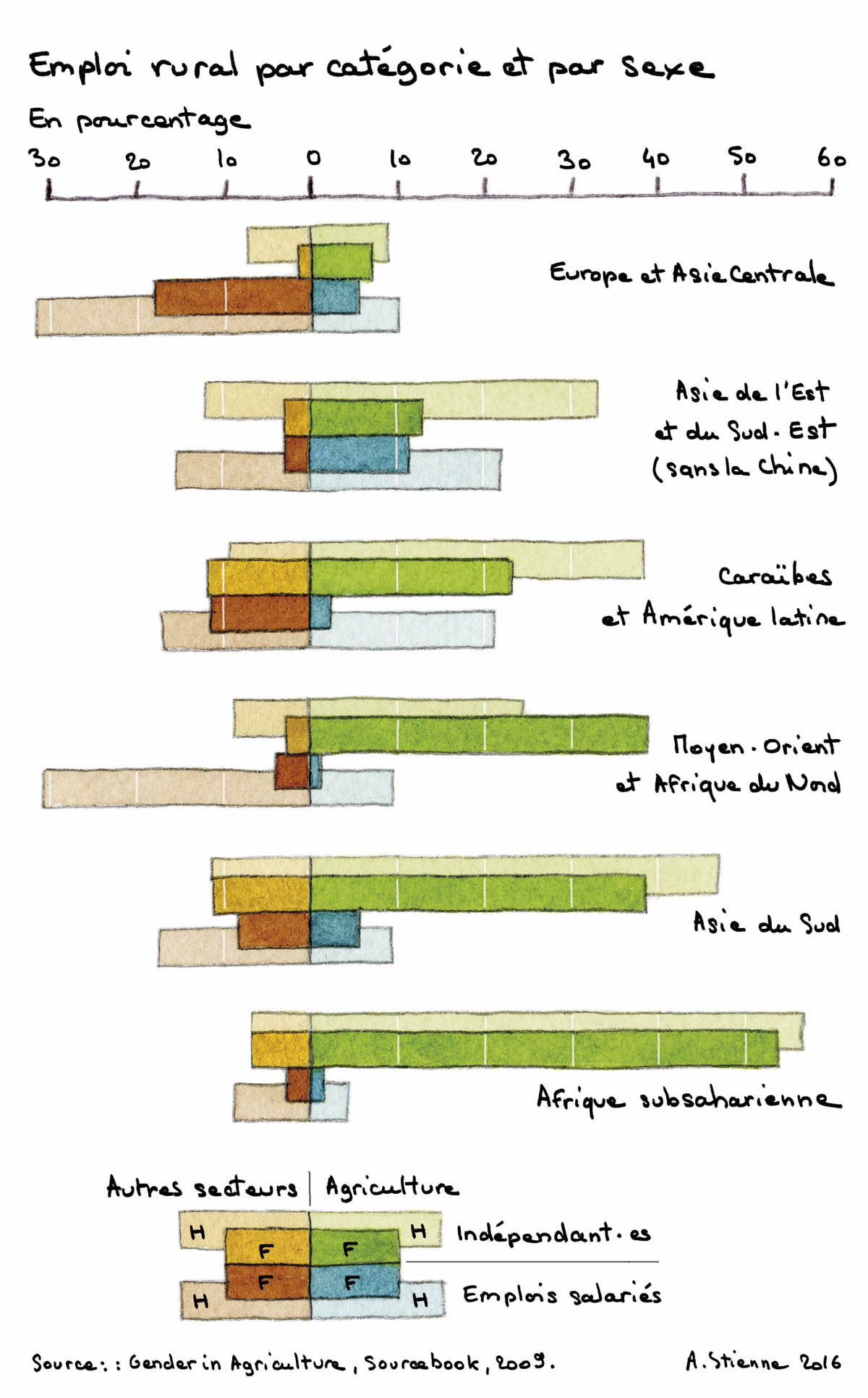 On trouve parfois dans les publications, des graphiques montrant, par sexe, la part des activités agricoles en pourcentage du trio agriculture/industrie/services. Ce calcul est problématique car il ne tient pas compte d’activités importantes comme le commerce-hôtellerie-restauration, le BTP ou le travail domestique. Or, pour ne citer qu’un exemple, la catégorie « commerce-hôtellerie-restauration » représente entre 20 % et 40 % des emplois féminins en Amérique latine. Ces graphiques offrent donc une image faussée de la répartition des emplois. Lorsque le trio agriculture/industrie/services a toutefois été utilisé, c’est que ces trois catégories sont calculées en pourcentage des activités économiques totales.