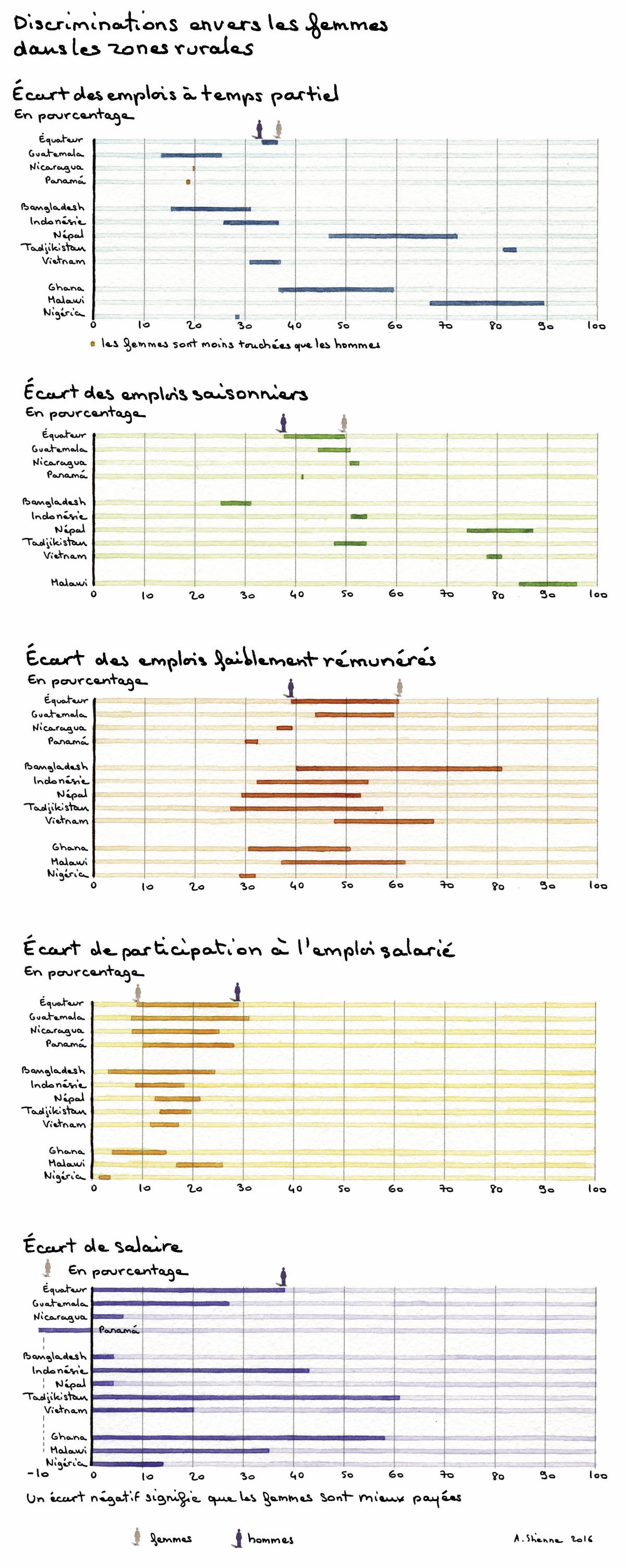 L’âge minimum retenu par l’Organisation des Nations unies pour l’alimentation et l’agriculture (FAO) ou la Banque mondiale pour recenser les populations actives est de 15 ans. Les populations actives comprennent les personnes en âge de travailler et les personnes en recherche d’emploi. Sont exclues les retraitées et les personnes au foyer. La population féminine active dans l’agriculture est composée des exploitantes indépendantes, des travailleuses non rémunérées dans les exploitations familiales, des travailleuses rétribuées ou non dans les autres exploitations ou entreprises agricoles. Mais il faut considérer ces données avec prudence. Les statistiques nécessaires pour cartographier les discriminations du travail salarié rural n’étant pas disponibles, nous utiliserons celles du projet Riga (sur les activités rurales génératrices de revenus) mené par la FAO, et portant sur une sélection restreinte de pays en voie de développement. La liste des graphiques montrant les inégalités est sans fin, nous n’en retiendrons qu’une partie.