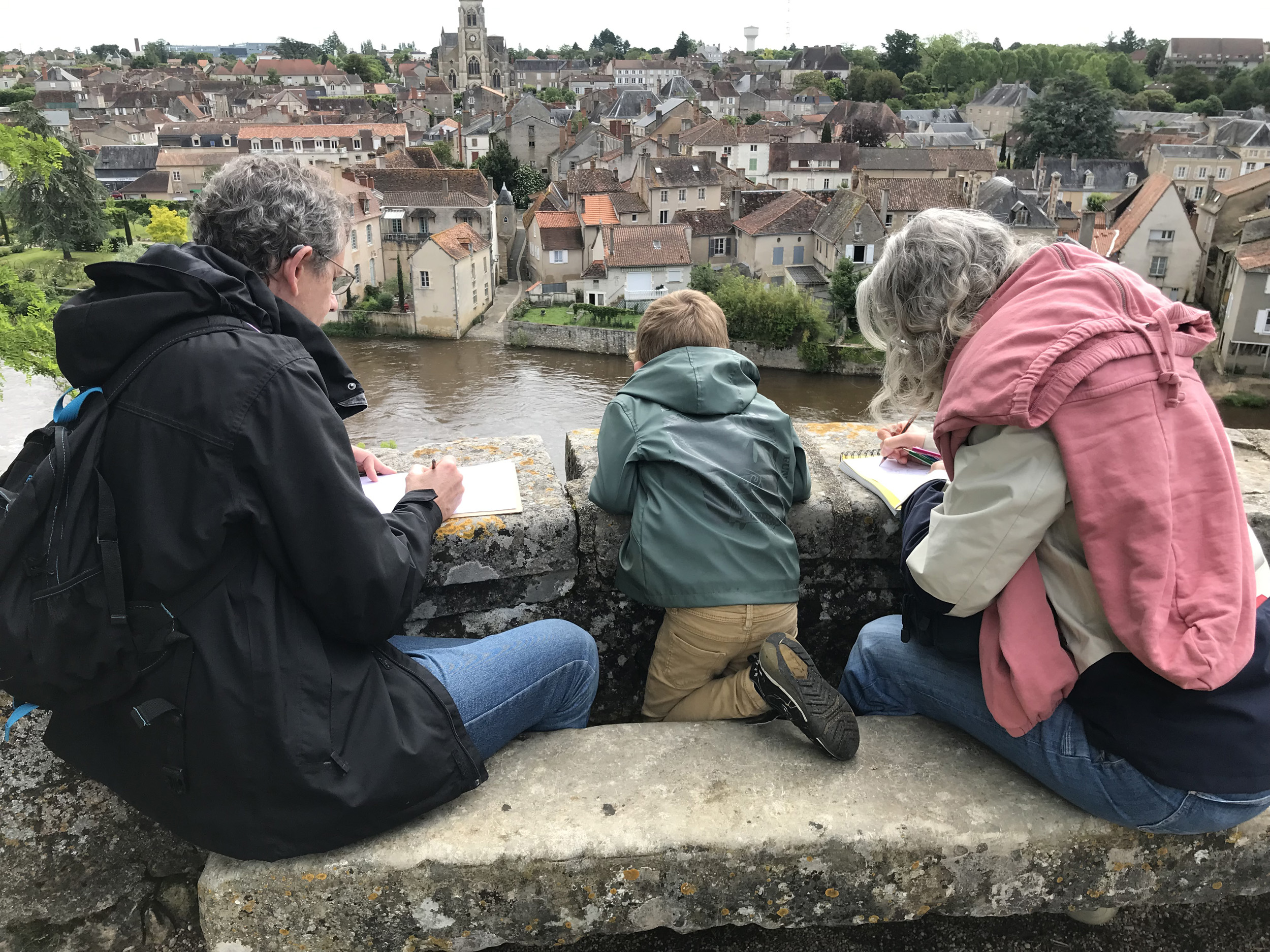 Christine, qui revient pour la troisième année consécutive à Montmorillon, évoque l’émotion que la ville a suscité en elle, de par les rencontres qui s’y sont produites : « La première fois, c’était une pizza partagée en famille sur le quai, avec vue sur l’église Notre-Dame d’où sonnent les cloches aujourd’hui. L’autre fut la découverte de ce magnifique parc privé (où se marient aujourd’hui des jeunes gens), en compagnie de Marion et Manal, mes équipières de choc pour découvrir le secret du lien à Montmorillon. Et enfin, l’incroyable discussion sur la terrasse du Roman des Saveurs l’année dernière avec Nepthys, que je remercie et que j’admire pour son courage. Il y a pour moi une grande spiritualité et de l’Amour à Montmorillon. Quel discours, quelle carte pourrait en rendre compte ? »