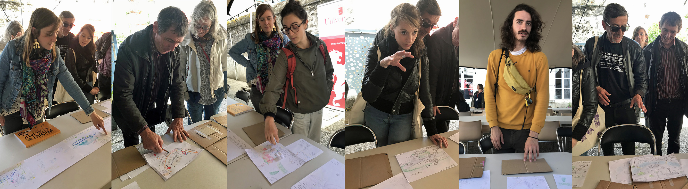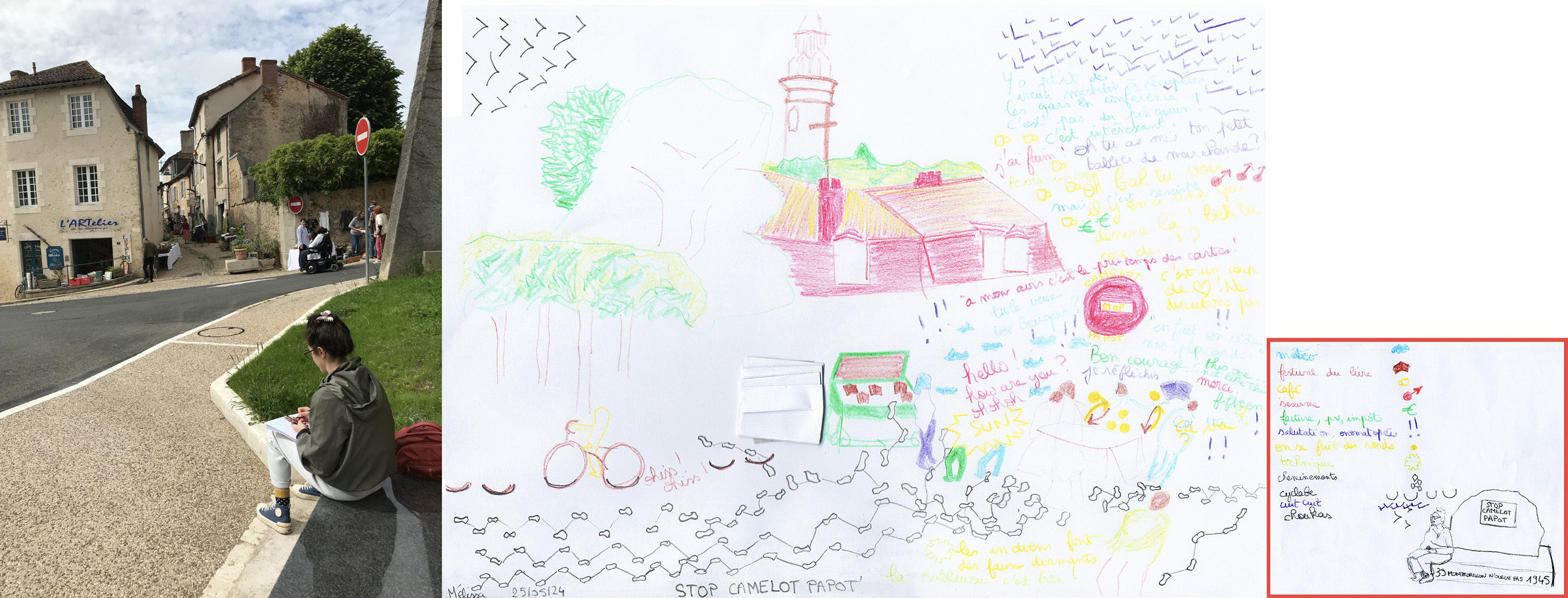 Mélissa : « Après un petit arpentage, je me suis installée au pied d’un monument de commémoration aux morts depuis lequel j’ai commencé par repérer des traces de vies, des éléments bâtis et des végétaux symboliques de ce bout de cité. À noter, en contre-bas de mon poste d’observation, je sais qu’il y a une rue à laquelle on accède par un escalier d’une grande largeur (au moins 10 m). Mais depuis mon monument, je ne vois rien de ce qui s’y passe, à part le premier étage des habitations, RAS. Je me suis alors amusée, à mon emplacement devant un sens interdit, d’une brocanteuse qui arrêtait tous les passants avec sa camelot’. Peu à peu, ce petit carrefour dans la ’Cité de l’écrit’ s’est empli de discussions que j’ai tenté de capter tout en qualifiant leurs thèmes (la météo, le festival du livre, le café, le sexisme, les factures et impôts, les salutations, les transactions etc.). Aux échanges humains répondaient des échanges entre oiseaux, comme une battle, avec à ma gauche un son plutôt grave, type choucas, et à ma droite un son plutôt aigu, type moineau, manifestement ces derniers étaient en plus grand nombre. Mais je n’y connais rien en matière de PIAF. Enfin, j’ai également noté les types et les sens des cheminements, majoritairement piétons (à l’exception d’une dame à bicyclette), de ma gauche à ma droite, mais jamais de derrière à devant, ou de devant à derrière mon poste d’observation. »