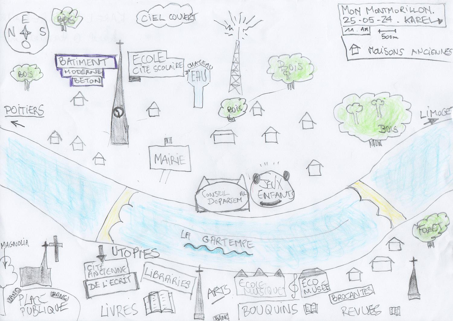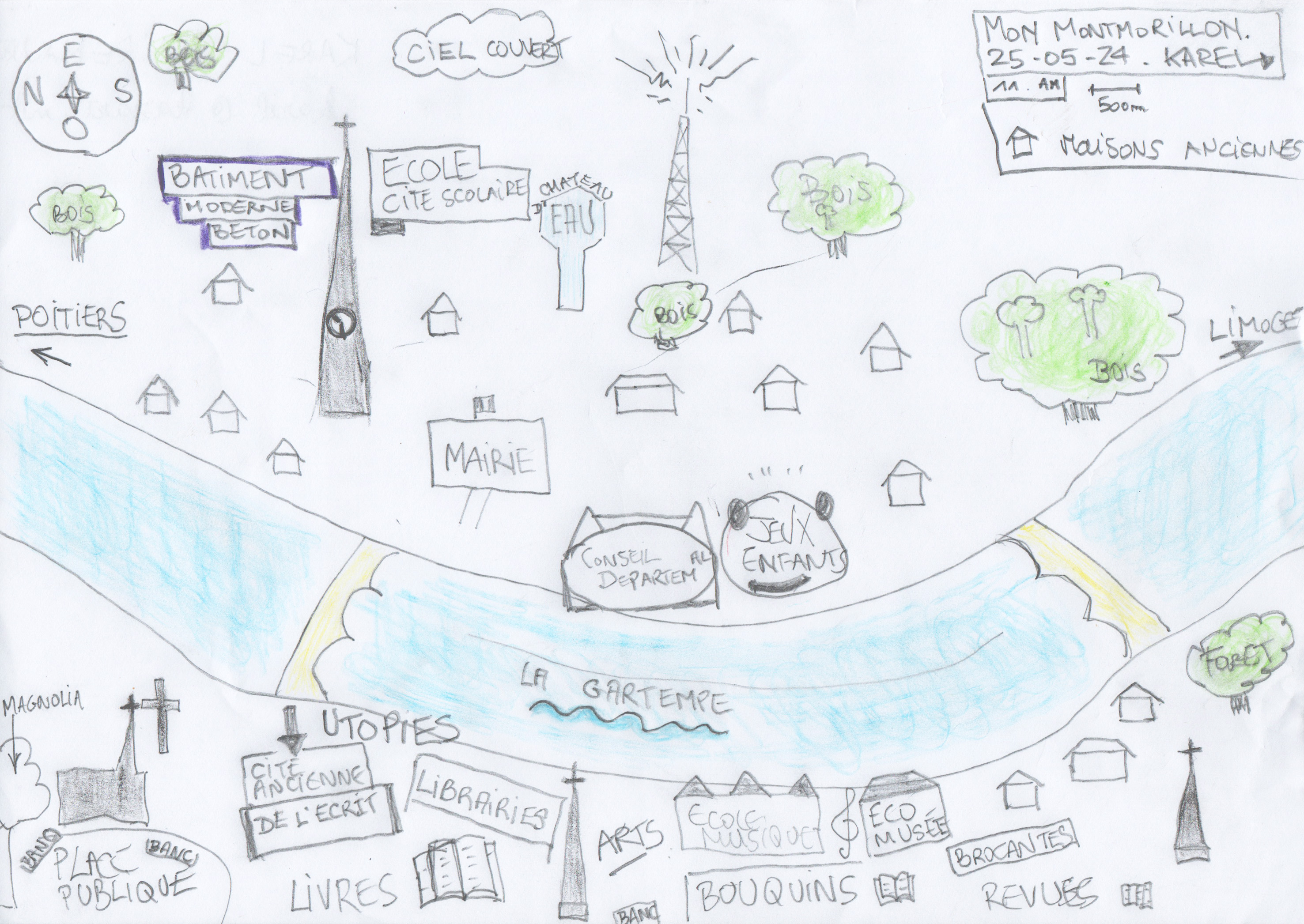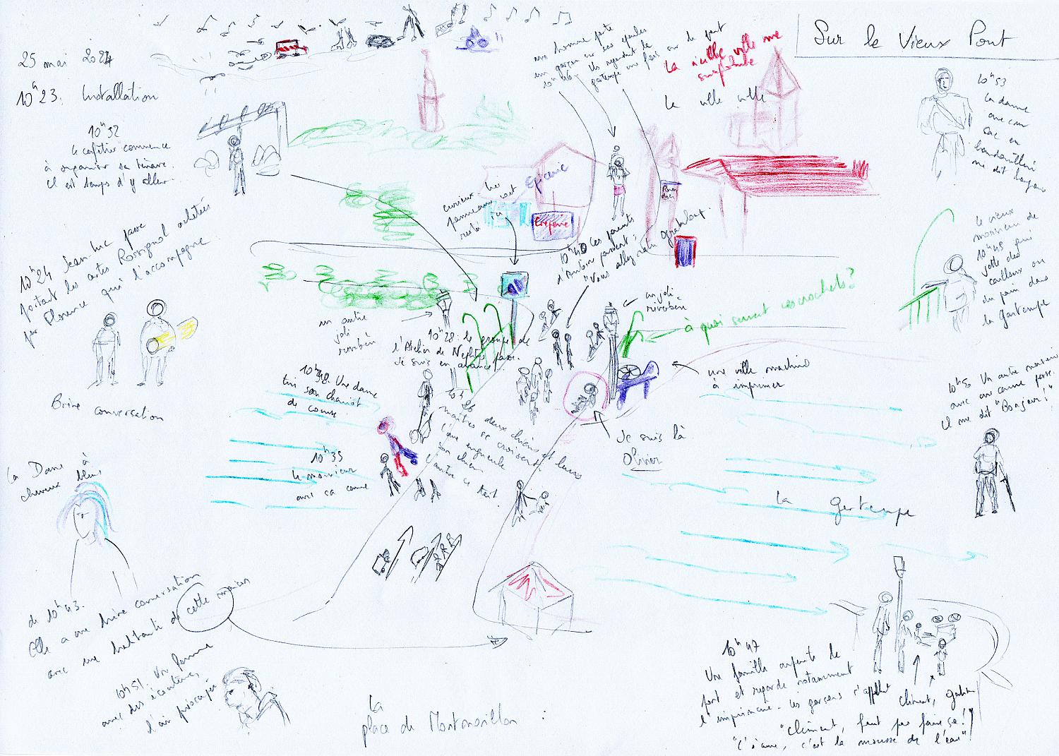 Olivier : « Je me suis assis au pied de la montée, le pont me semblait idéal, et avoir une vieille machine d’imprimerie à côté, sous un beau réverbère, me semblait un signe. Je n’avais pas d’idée préconçue, sauf à me laisser aller : voir, écouter, sentir, ressentir. Le vent, l’eau de la Gartempe qui s’écoule, les bruits de pas, le chant des oiseaux, le vacarme des véhicules, la fraîcheur ensoleillée de la matinée : difficile de le dessiner tout cela, encore plus de le cartographier ! Finalement ce sont beaucoup les passants qui m’ont intéressés, normal sur un pont, lieu de passage obligé par excellence. Le plus inattendu a été d’échanger avec des passants que je connaissais, j’ai dû assumer. Voilà, une heure, ça passe très vite : j’ai l’impression d’avoir fait un dessin gribouillis plutôt qu’une carte, même sensible... »