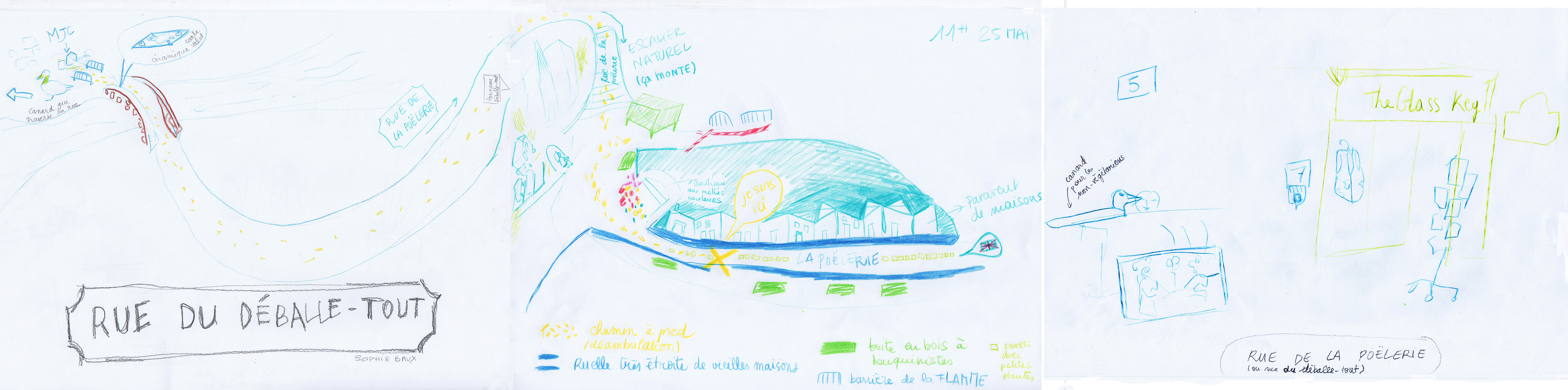 Sophie : « Cette carte raconte le cheminement à pas "jaune" de la MJC jusqu’à la rue de Poëlerie, le grand jour du déballe-tout. Le centre bourg historique était vide jusqu’à la grande montée menant sur les hauteurs. Cette rue étroite est peuplée d’antiquaires et brocanteurs. Un panorama de petits trésors se déploie derrière un paravent de maisons mitoyennes. Je me suis cachée derrière un étal drapé, perchée sur un petit escalier en pierre où poussent fièrement quelques jolis pissenlits. À l’abri des regards, j’étais témoin de conversations d’un anglais élégant et caustique sur les dernières trouvailles "non-vegans". »