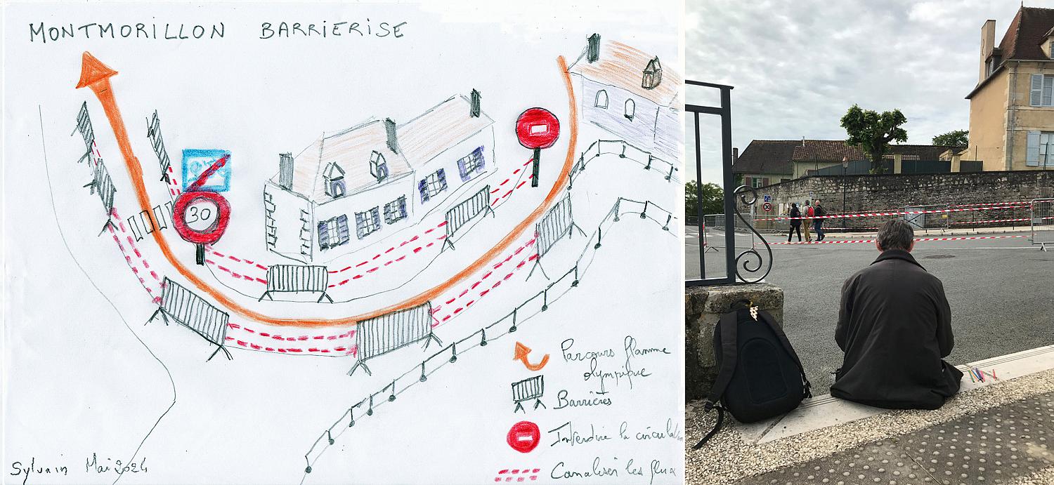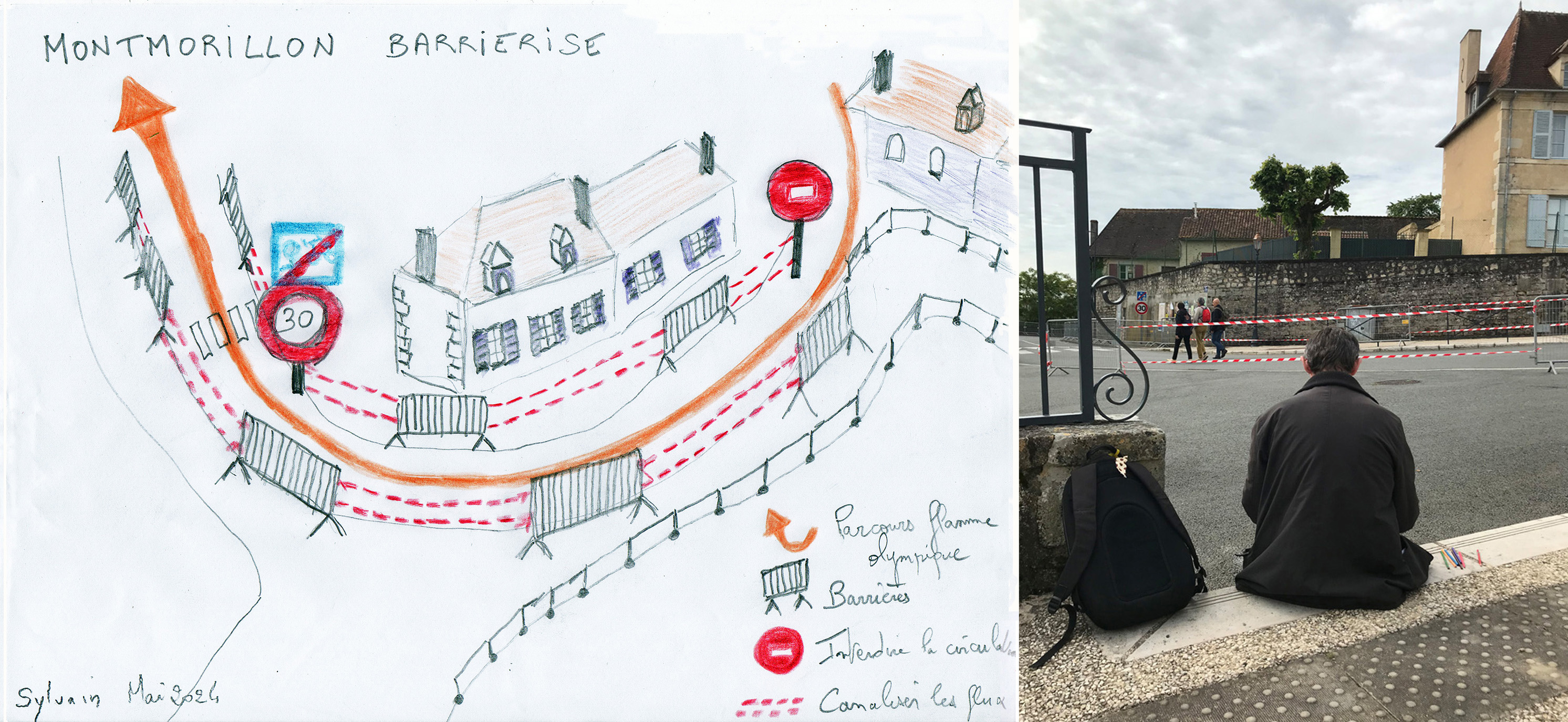 Sylvain : « La carte sensible comme lecture politique de la ville. Ce matin-là, Montmorillon était étrangement immobile, comme figée dans l’attente d’un grand événement qui était censé capter toute l’attention (capturer l’imaginaire ?) : le passage de la flamme olympique. Étrangement il n’y avait quasiment personne dans les rues. Comment ne pas voir pourtant ce qui sautait aux yeux ? Des barrières alignées partout dans la ville, le long des trottoirs, sur les places publiques, aux carrefours des rues pour canaliser le flot de spectateurs attendus l’après-midi au moment de l’arrivée de la flamme. Le message était clair : défense absolue de franchir ces barrières renforcées par des rubans de balisage rouge et blanc. Même les panneaux de circulation habituels finissaient par prendre un sens détourné. Logique sécuritaire avant tout en période de jeux olympiques : il s’agissait de canaliser les flux et de séparer la population du grand show publicitaire et médiatique. »