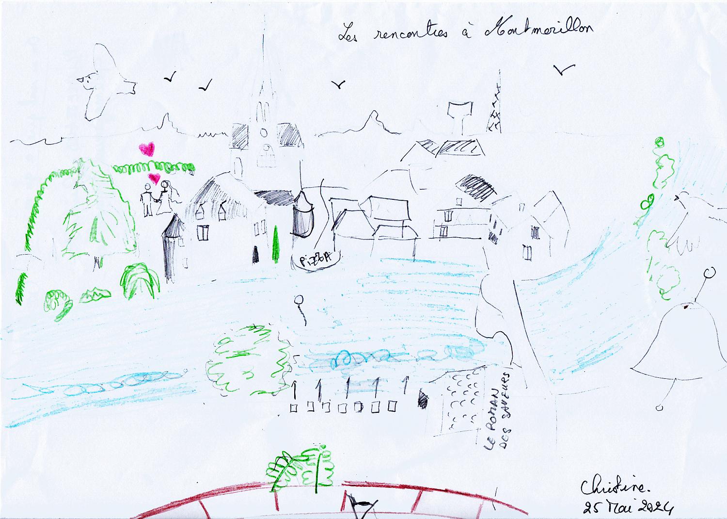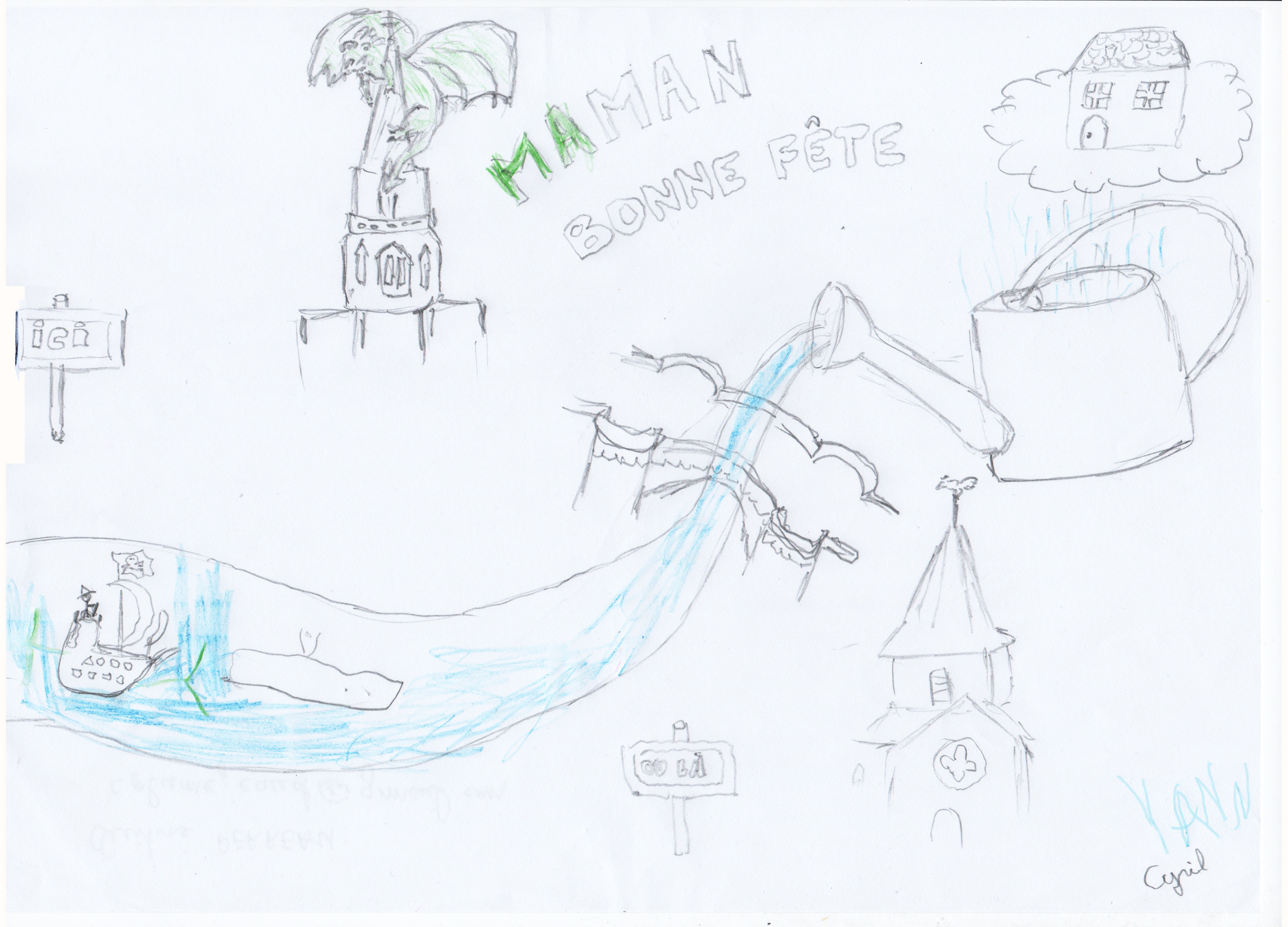 Yann et son papa ont dessiné la maison de Peter Pan, qui habite sur un nuage qui arrose le pays Montmorillonnais. Yann : « Mais attention, sur la Gartempe, il y a le capitaine Crochet, qui poursuit une baleine ! » Cyril : « Heureusement, les dragons veillent aussi sur les clochers... »