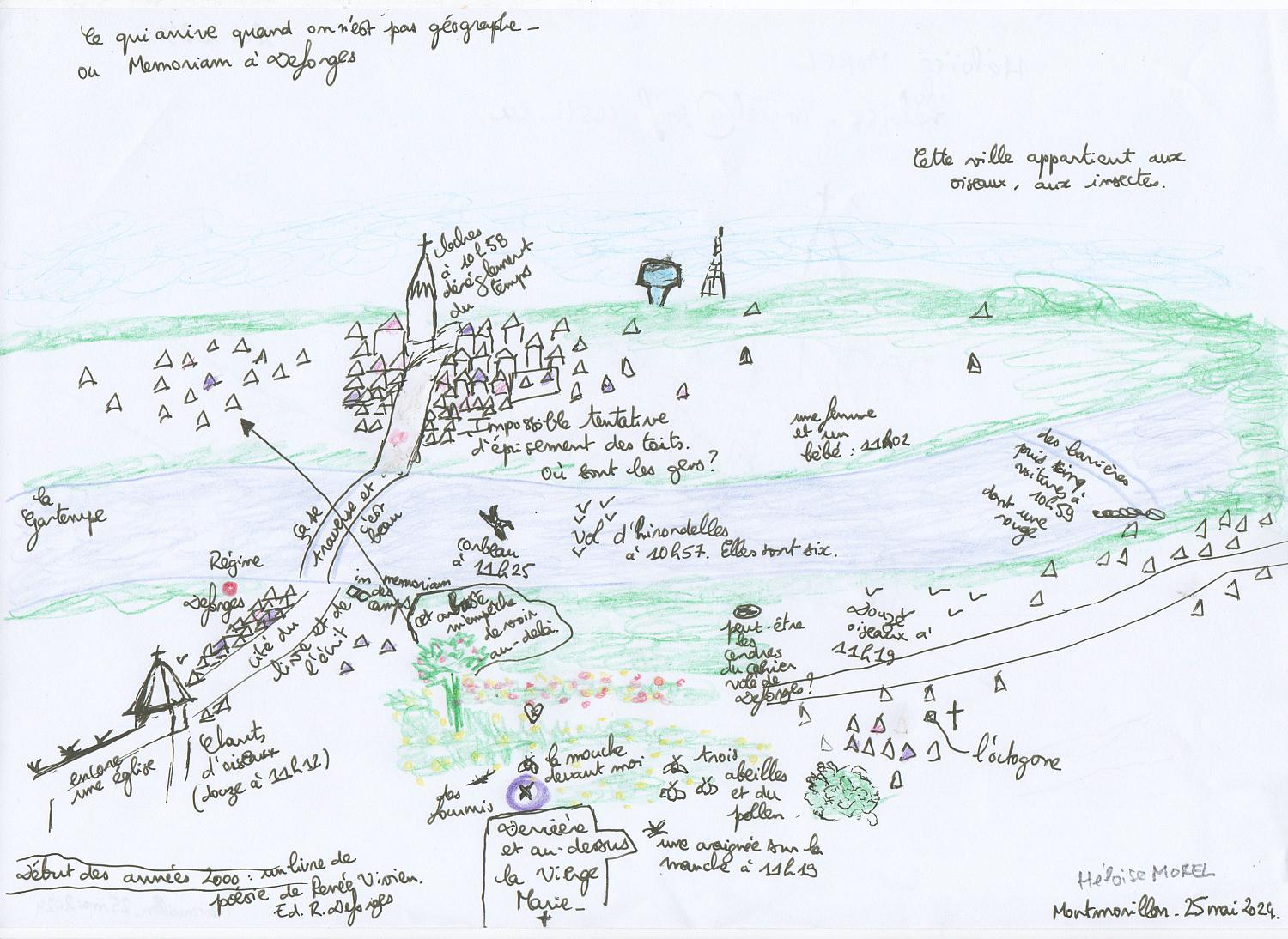 Héloïse : « J’ai choisi un panorama sur la Gartempe, surplombant une partie de Montmorillon depuis la vieille ville. De là haut, impossible tentative d’épuiser le réel tant les toits sont omniprésents, les oiseaux... Je tente une description à la minute de ce que je capte, des insectes, des chants d’oiseaux, une personne qui passe et le constat pendant l’heure qui s’écoule du peu de monde aperçu. J’ai mêlé à ce qui s’écoulait sous mes yeux, les souvenirs de Montmorillon : le lien avec l’écrivaine Régine Deforges, le livre que j’ai acheté environ 15 ans auparavant des poésies de Renée Vivien ; j’ai localisé la maison de Régine Deforges et j’ai imaginé un lieu qui pourrait être celui où son cahier volé a été brûlé. Carte mémorielle qui croise les instants de cette heure d’épuisement et de ravissement hors des codes de la cartographie normée ! »