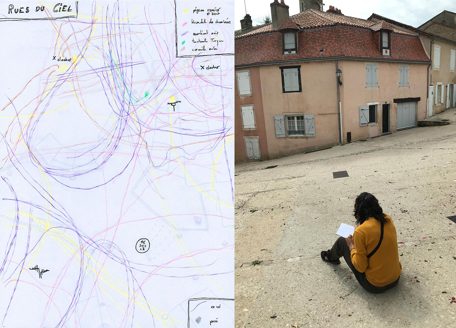 Simon : « Nepthys nous à dit d’oublier ce qu’on savait sur comment bien faire une carte. Au début j’ai recensé toutes les sources de lumières éteintes en imaginant leur faisceau à la nuit tombée, mais c’était un peu rébarbatif. En faisant cela j’étais distrait par les cris de martinets noirs qui filaient en petits groupes à la hauteur des toits. J’ai donc retourné ma feuille et pendant 45 minutes, j’ai reporté autant que possible les trajectoires dans le ciel des six premières espèces d’oiseaux que j’ai vues, je n’avais pas plus de couleurs avec moi et les hirondelles des fenêtres, les moineaux domestiques n’habitent donc pas ma carte. C’est dur de repérer à la vertical de quel endroit du sol vole un oiseau : les deux clochers, les deux antennes qui figurent sur ma carte sont autant un repère pour les oiseaux volant que pour moi cartographiant. »