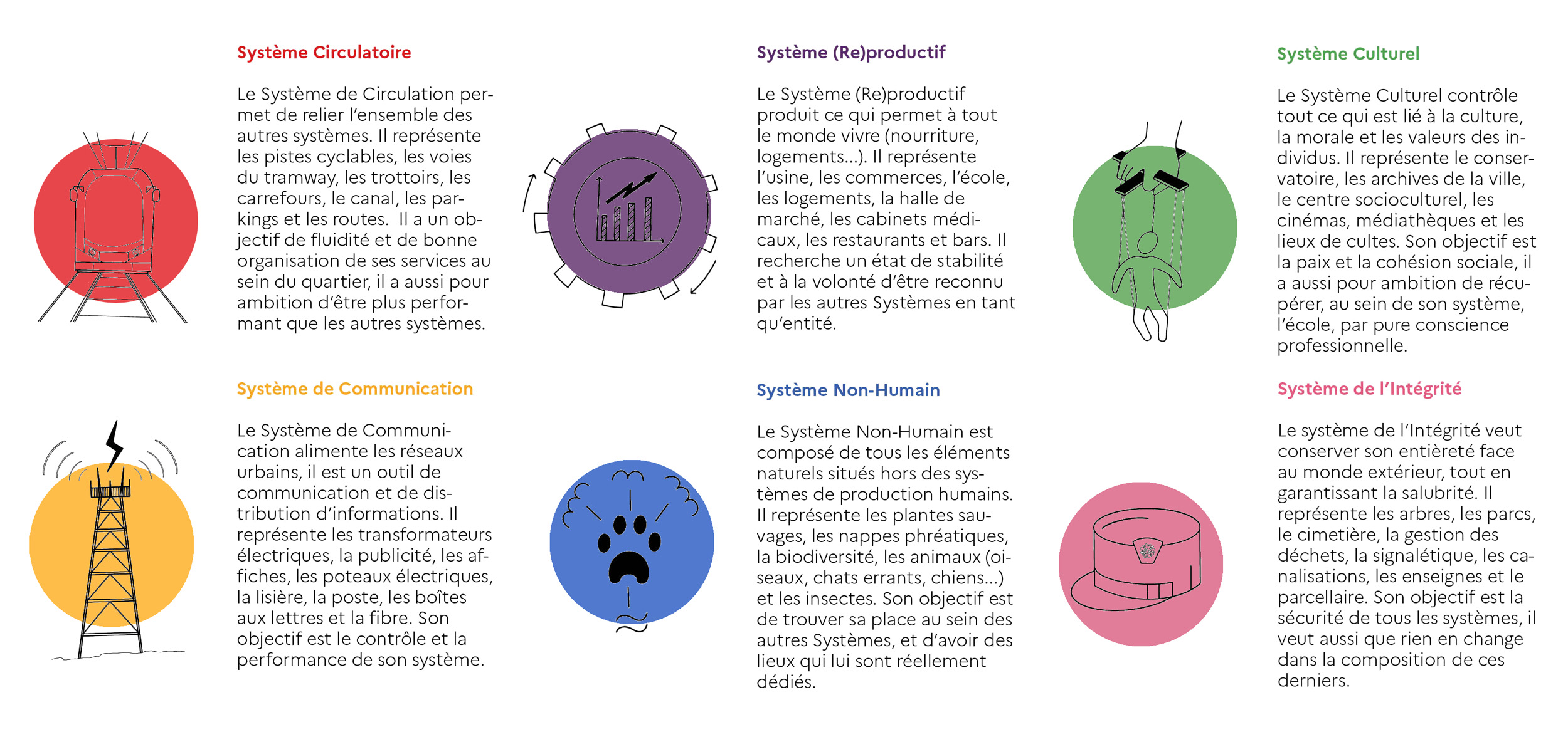 La création des différents systèmes du quartier a pu se mettre en place suite à notre cartographie. Nous avons identifié les instances les plus visibles et les plus décisives dans le territoire pour faire une adaptation entre le jeu After the Maestro et le nôtre. À titre d’exemple, il a été souligné que le quartier était un lieu de passage avec des grands axes pour se déplacer rapidement. Le système sanguin de Tom K Kemp est devenu pour nous de Système de la Circulation. Au final, 6 systèmes ont été définis : circulatoire, (re)production, non-humain, intégrité, culturel et communication.