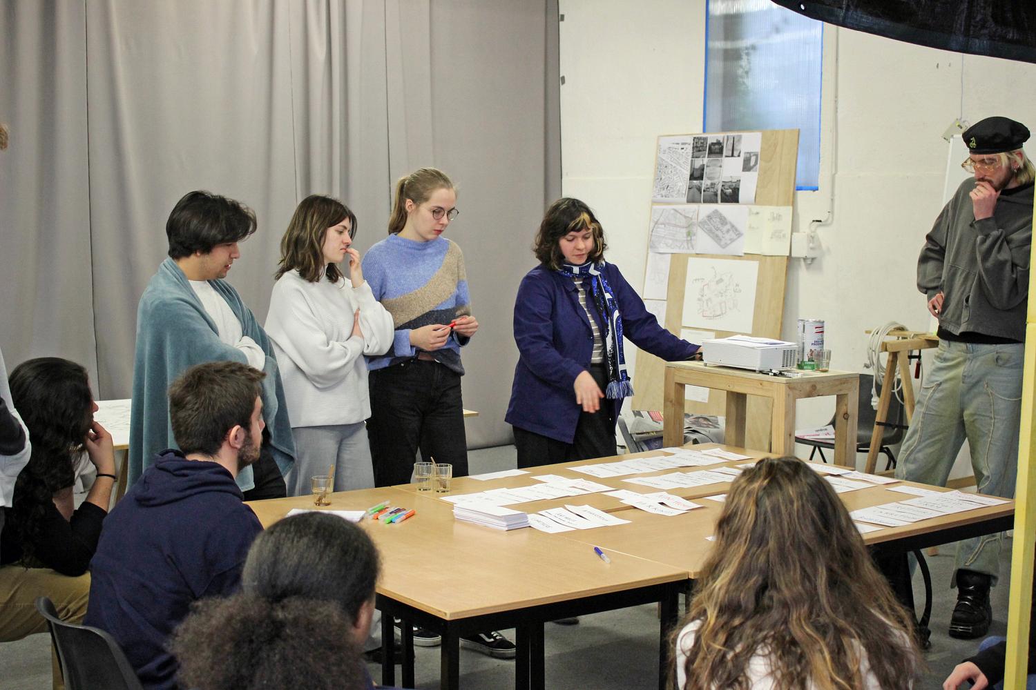 En décembre 2023, nous avons été invités par l’équipe des arts plastiques et visuels de l’École Nationale d’Architecture de Strasbourg, en partenariat avec le Syndicat Potentiel, pour intervenir auprès de ses étudiantes lors de la Semaine Intensive d’Art qui a lieu en janvier 2024. Intitulée Pratique manifeste, celle-ci s’inscrit en perspective des orientations qui structurent le nouveau programme pédagogique de l’ENSA Strasbourg : temporalités, héritages et transformations ; matérialités, création et expertise technique ; habitabilité, habiter et enjeu social ; ressources, milieux et prospectives. Comme son nom l’indique, la SIA est un workshop de 5 jours intensifs où les étudiantes sont invitées à rencontrer la pratique d’artistes-intervenantes vis-à-vis de leur pratique de futures architectes.