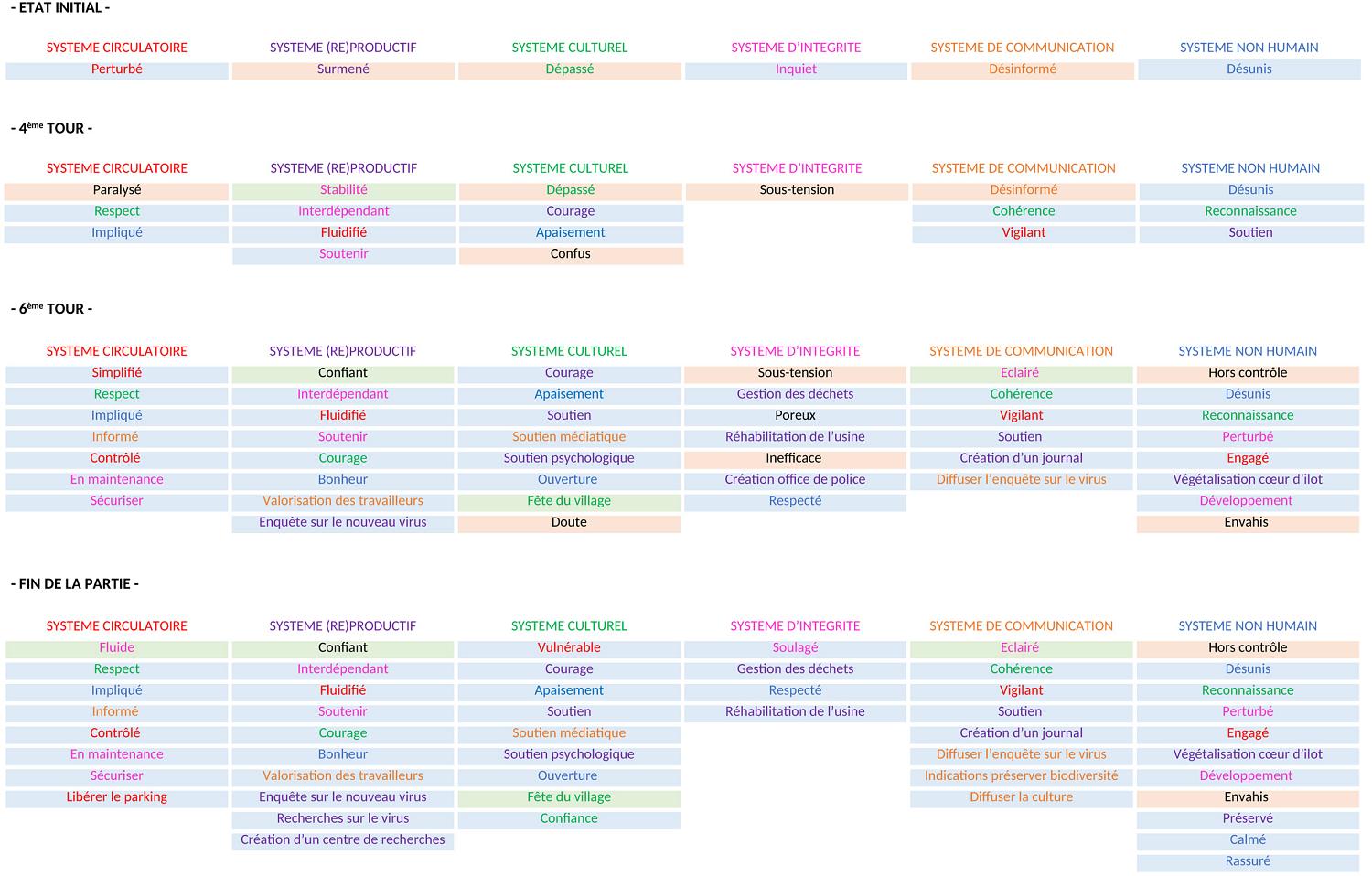 le bilan : annonce des actions réalisées et inscription sur la carte des changements opérés au cours du round (comptabilisé comme une durée d’un mois passé dans le jeu). Le système culturel étant en charge de la mémoire collective de la communauté, il retranscrit avec son libre arbitre le mois écoulé. Tous les autres systèmes inscrivent sur la carte évolutive les transformations apportées au quartier en fonction de leur action.