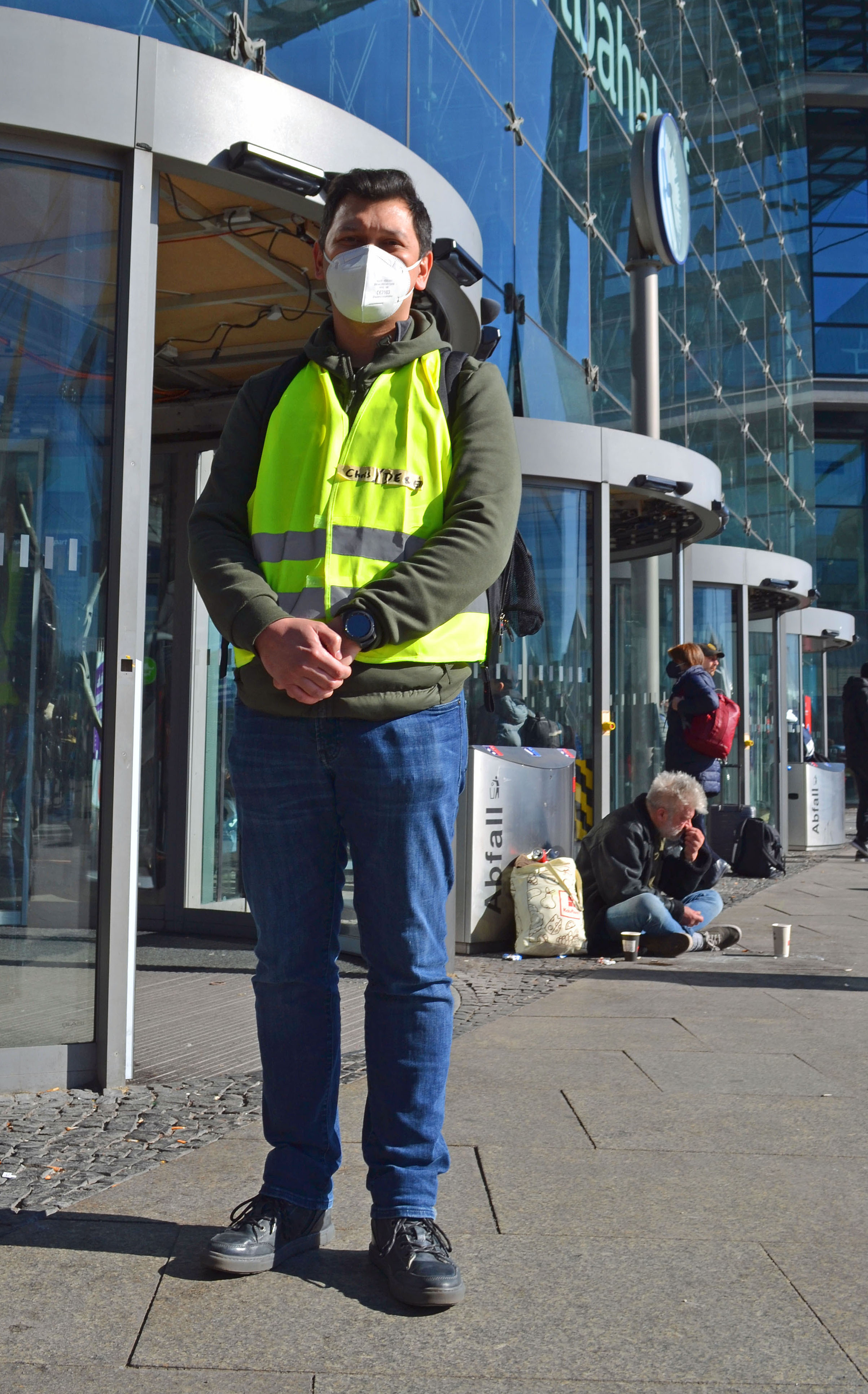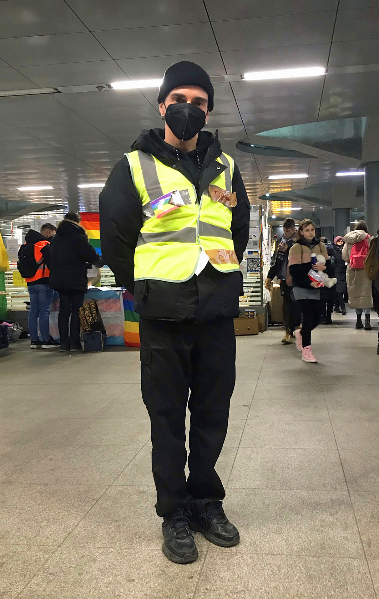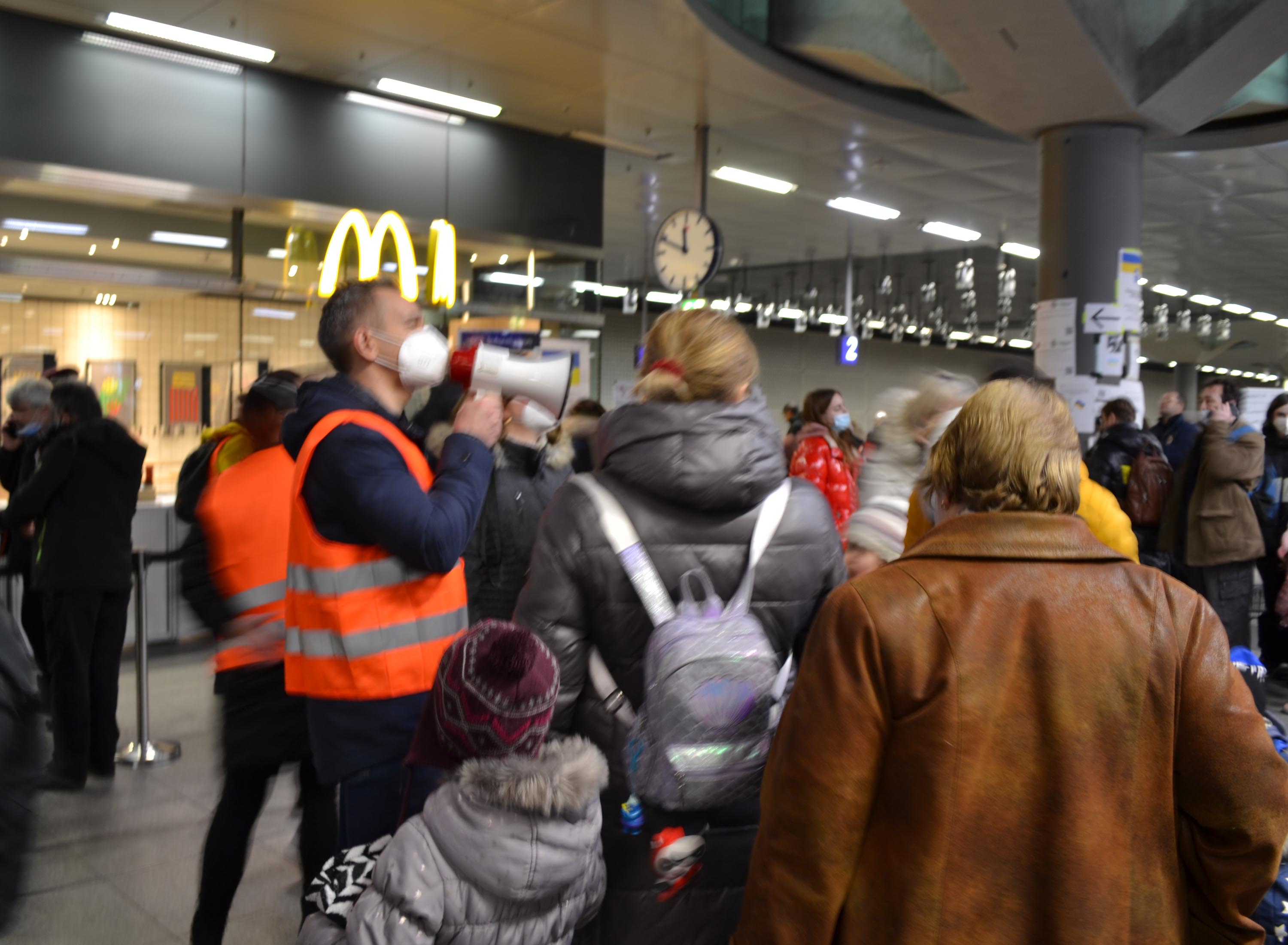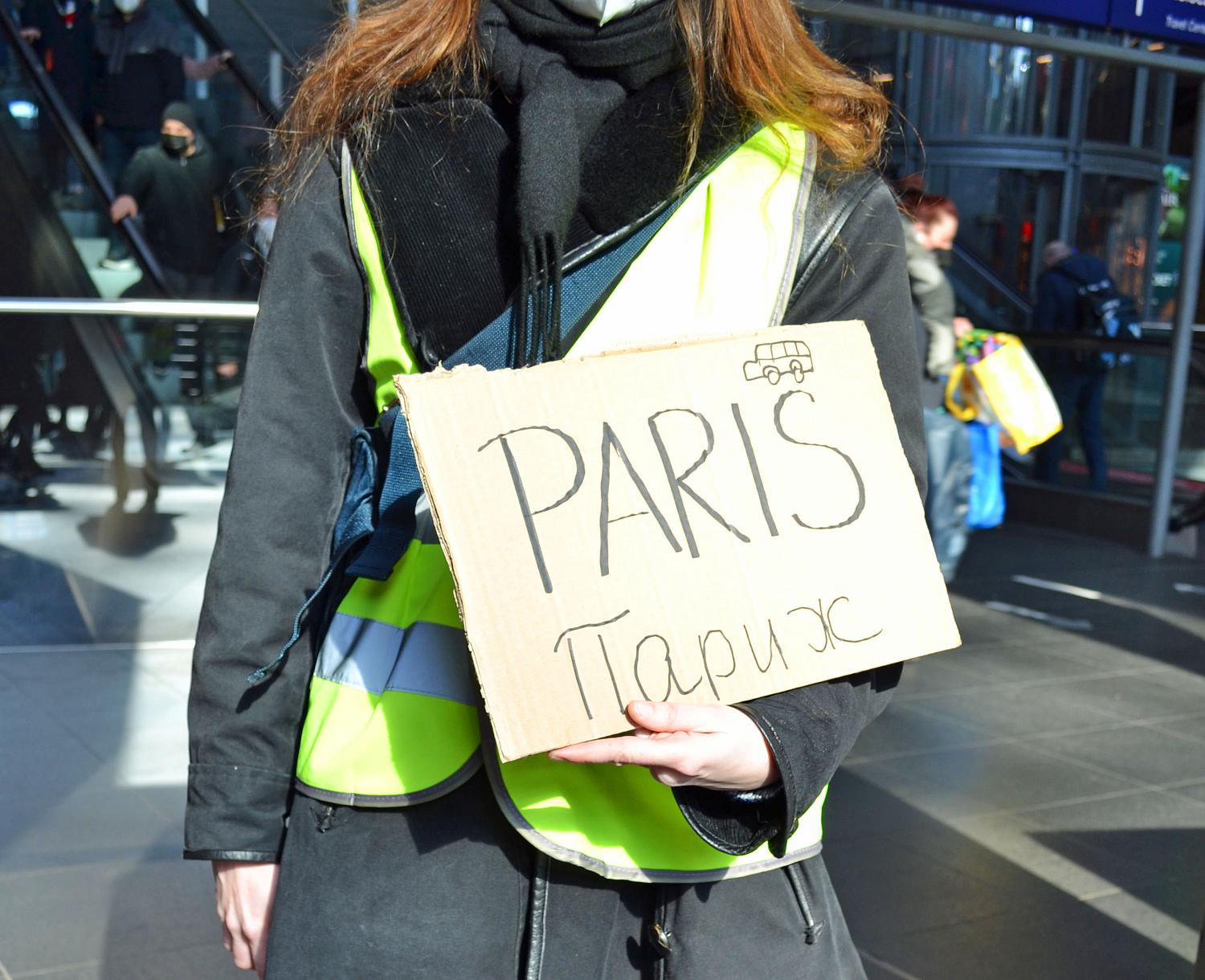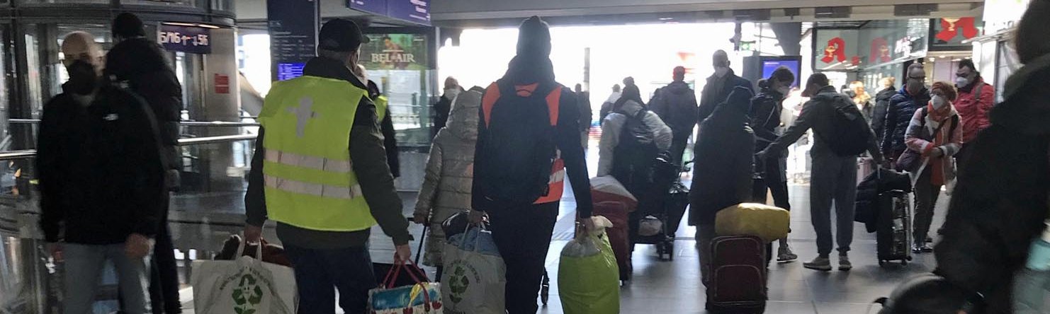 Sur le parvis de la gare, Chris conduit une famille réfugiée vers le bus. C’est son deuxième jour. Il n’en pouvait plus de voir les images de la guerre à la télévision. Il ne voulait pas rester inactif, impuissant. L’une de ses amies se trouve actuellement à Kiev. Le gilet jaune ou orange est le signe distinctifs des aidantes. Muni d’une application de traduction, il explique où aller. Comment se procurer un ticket, une carte sim, où trouver un endroit pour dormir, où trouver une collation ?