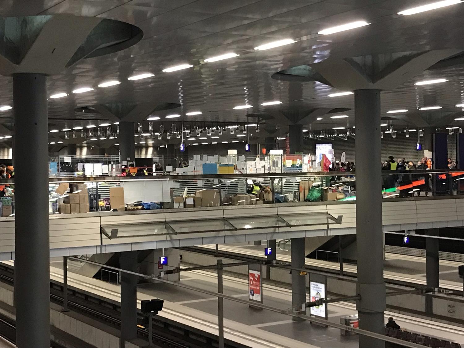Entre deux couloirs, les bénévoles ont installé un point de distribution. Les dons d’objets posent un problème logistique, il faut les stocker et les distribuer. À l’étage inférieur, une zone de repos, avec des matelas au sol.